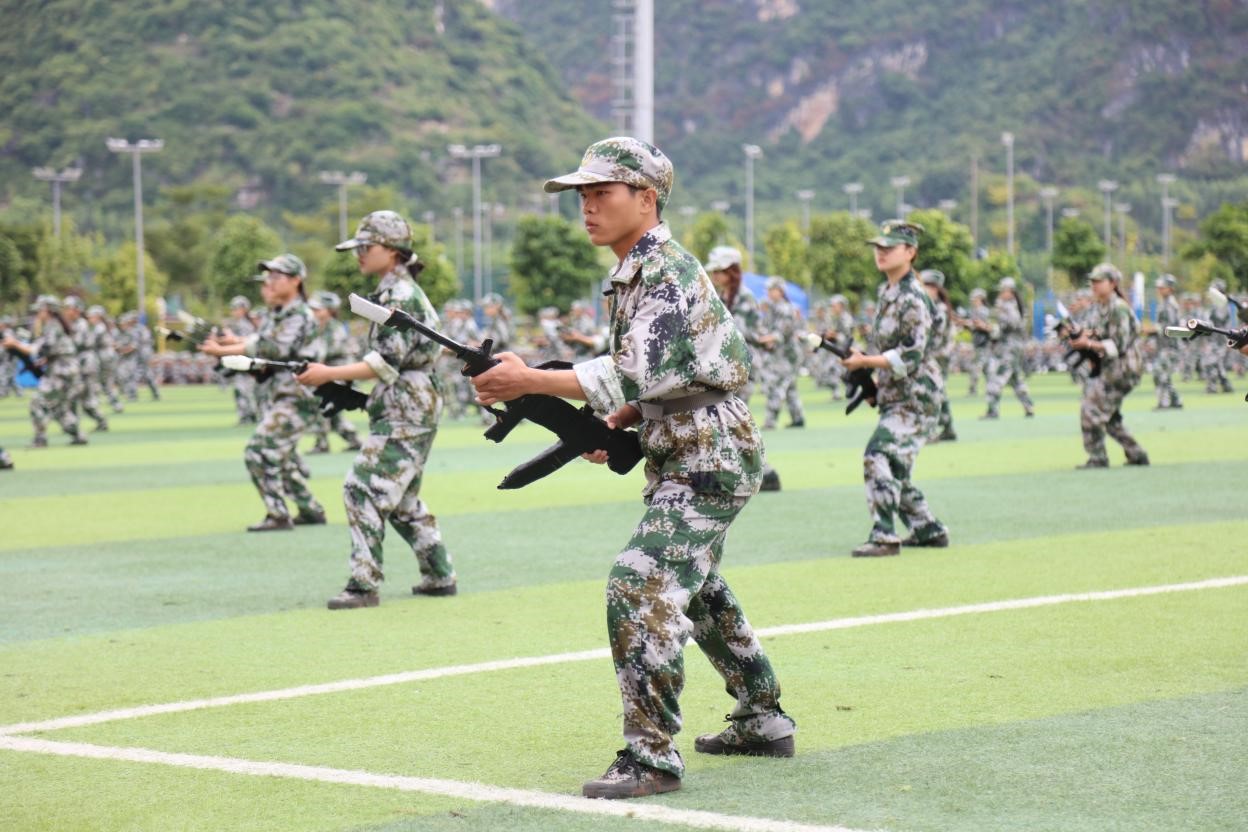 在军事技能训练科目展示环节中,军训团六个营分别进行六个科目展示,豪情满怀的呼声连连响彻操场上空。整齐划一、口号嘹亮的分列式展示尽显国商学子的飒爽英姿与豪情壮志;动作精练、刚劲有力的军体拳打出了国商学子的气魄和胆识;吼声铿锵、动作威猛的刺杀操瞬间点燃现场氛围,锤炼国商学子敢于亮剑的血性胆气;目光如炬、气势恢宏的警棍盾牌术在攻守转换之间打造了国商学子临危不惧的品格;行云流水、刚柔并济的武术表演展示出国商学子英勇顽强的精神;硝烟弥漫、枪声骤起的战术演练燃烧起国商学子的军魂,尽显英雄本色。