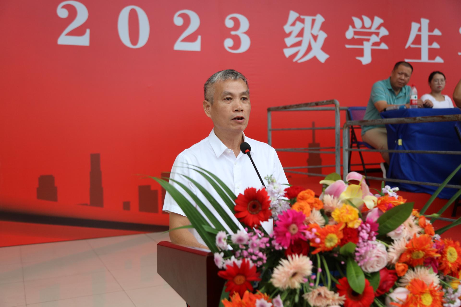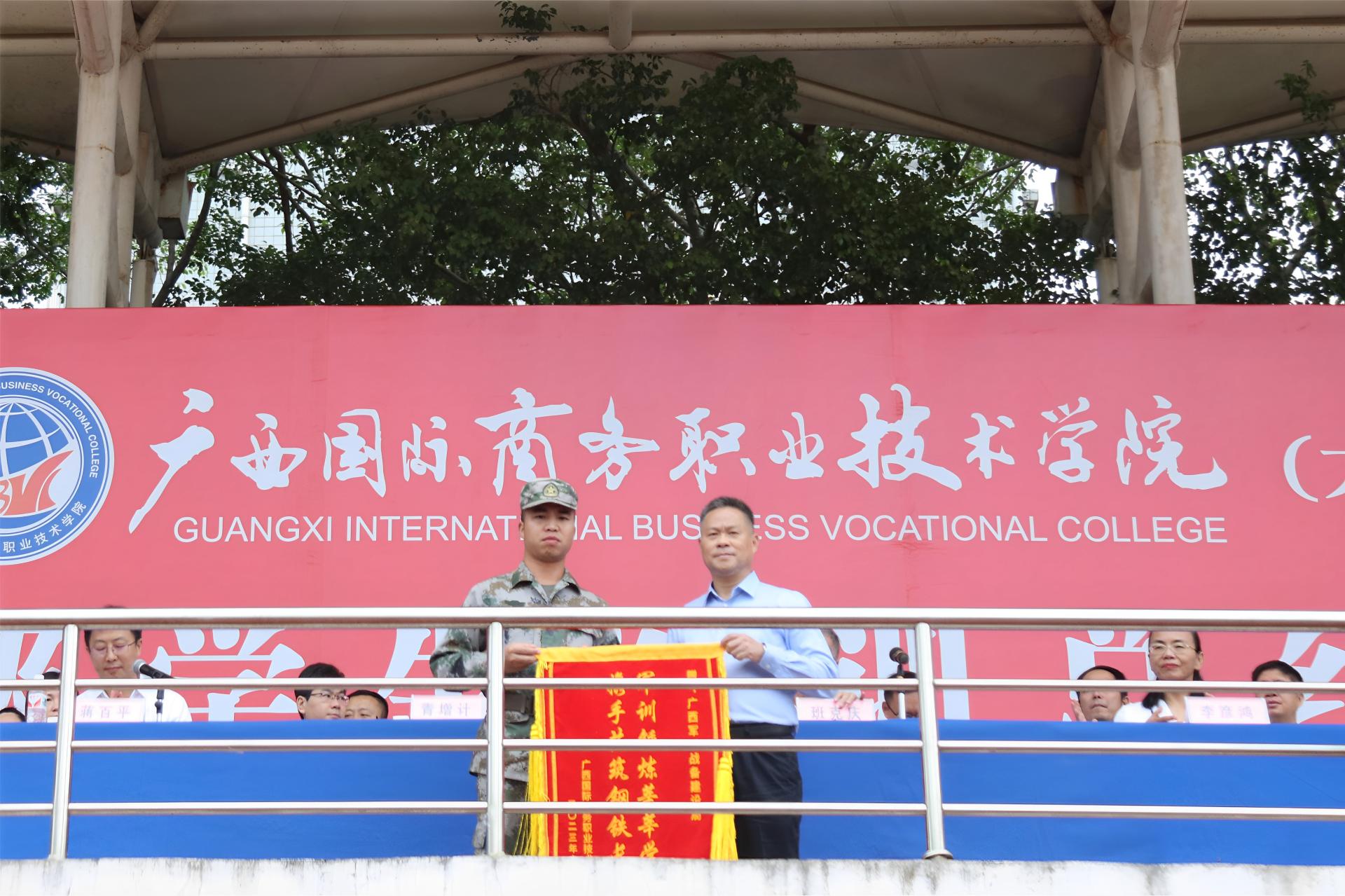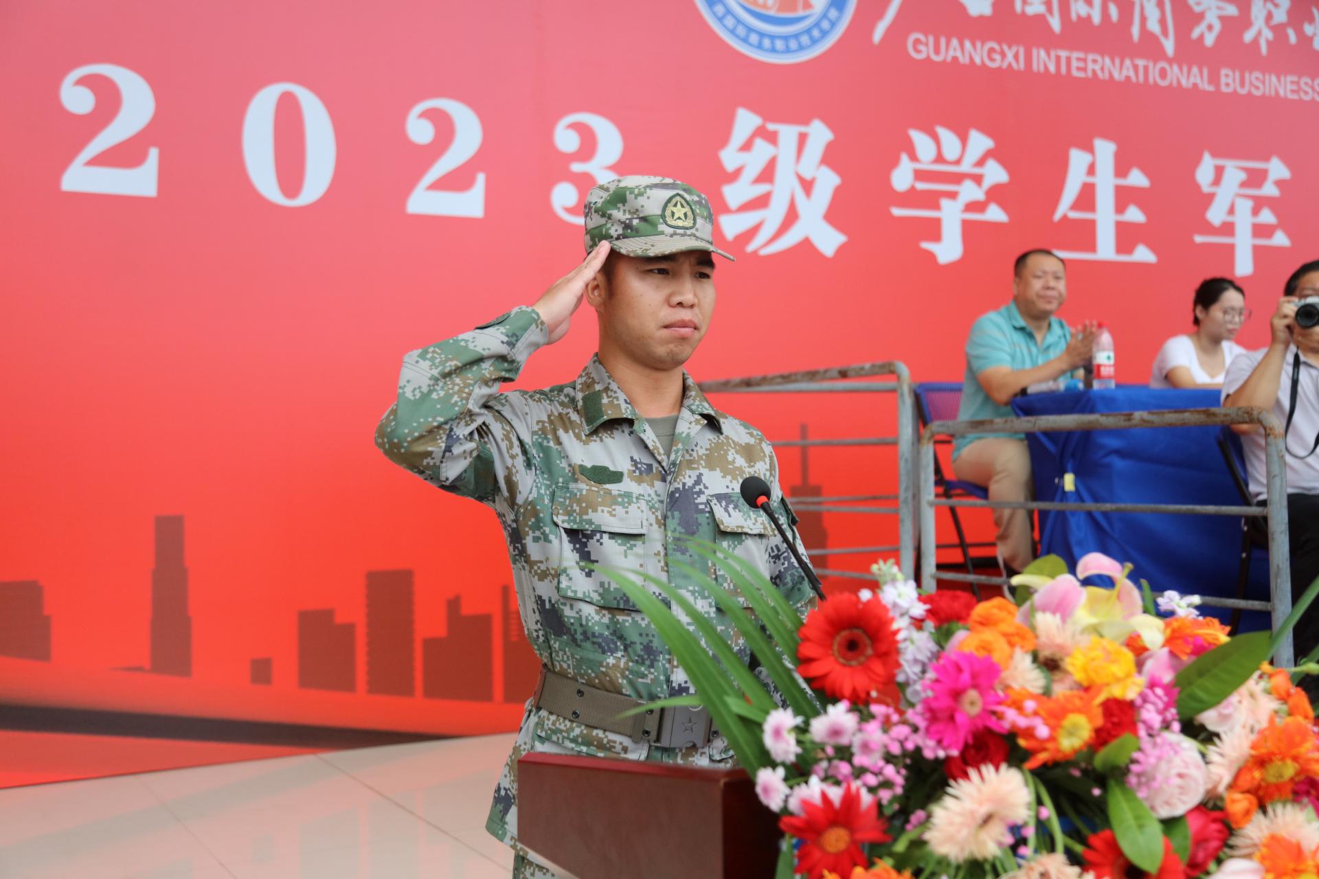 学校党委副书记青增计,副校长班克庆,南宁市第六职业技术学校副校长李彦鸿,承训单位领队杨志欢等领导出席大会,学校各相关职能部门、二级学院有关负责人、承训教官及大学路校区2023级新生共同参加。学校副校长蒋百平主持大会。