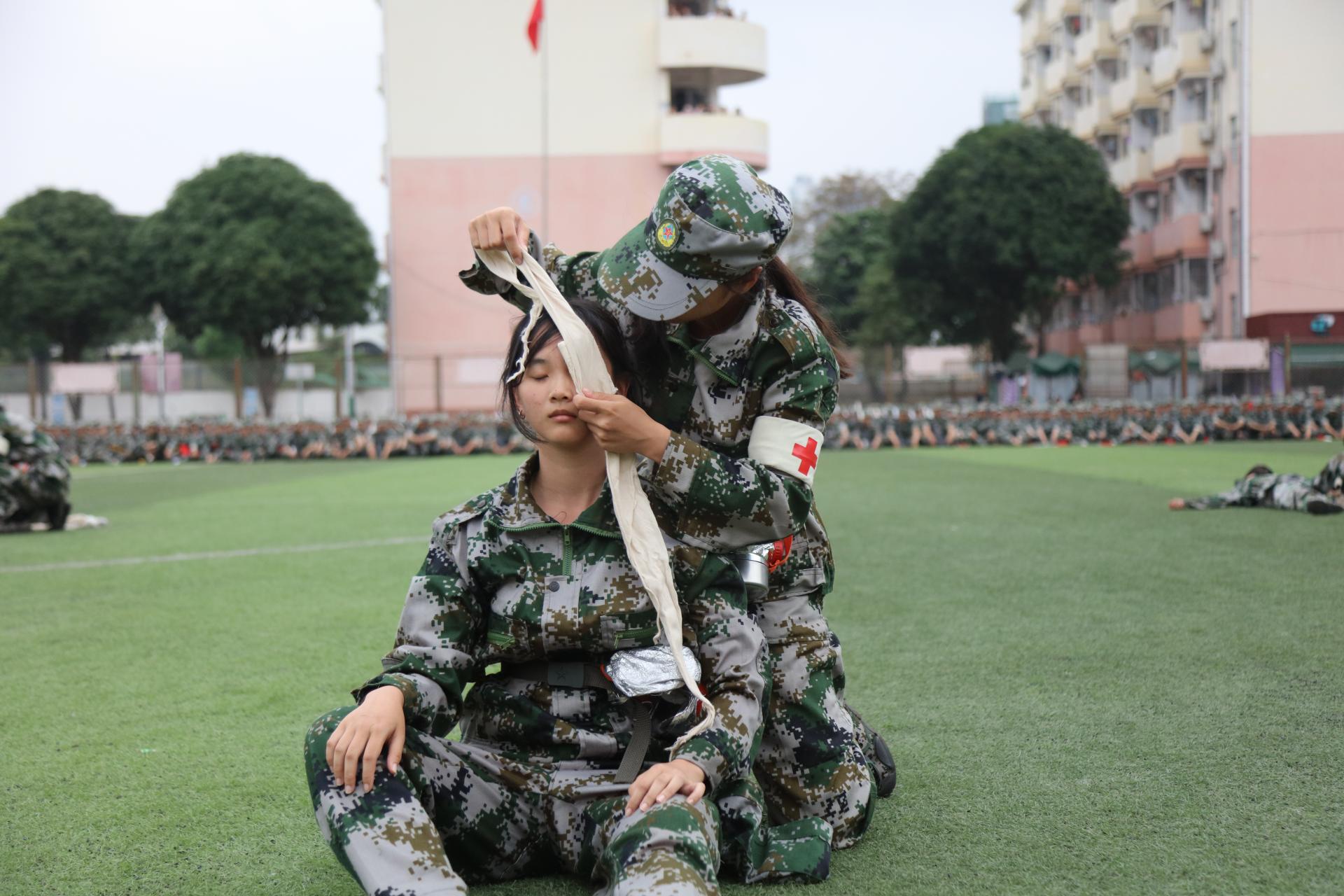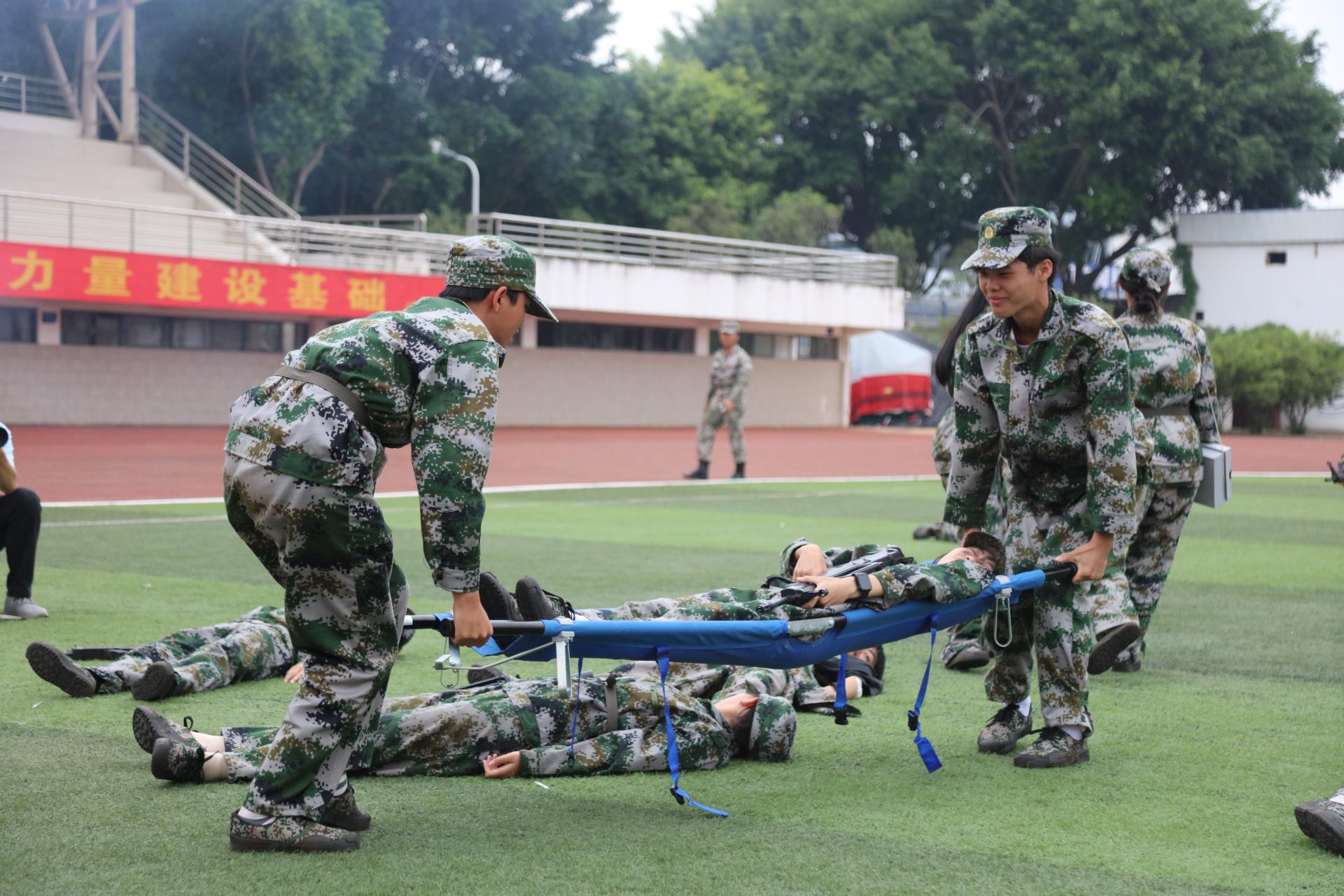 随着口号声气贯长虹,大学路校区2023年度学生军事技能训练成果展示正式开始。参训同学依次展演了分列式、刺杀操、大刀术、警棍盾牌术、战场医疗救护和战术综合演练等科目,精彩的表现赢得了观礼台上各位现场观众的阵阵掌声。此次大学路校区的军训汇演中,战场医疗救护方队在硝烟弥漫的模拟战场上化身白衣天使,以最快的速度和过硬救护的技能,为伤员的生命保驾护航。心肺复苏、头顶帽式包扎、单眼包扎、小臂骨折固定和小腿骨折固定等多项急救内容的展示演练,不仅展现了同学们专业的应急救护知识,更体现了同学们在关键时刻临危受命的担当和勇气。而战术综合演练则呈现出了敌我双方紧张而激烈的对峙。黄埃散漫风萧索,一矢破敌万军中。伺机而动的战士,怀着将“敌人”击倒的信念,默契配合,战术动作辗转腾挪。扛枪而上的国商学子英勇果敢、正气凛然,保家卫国勇当先!