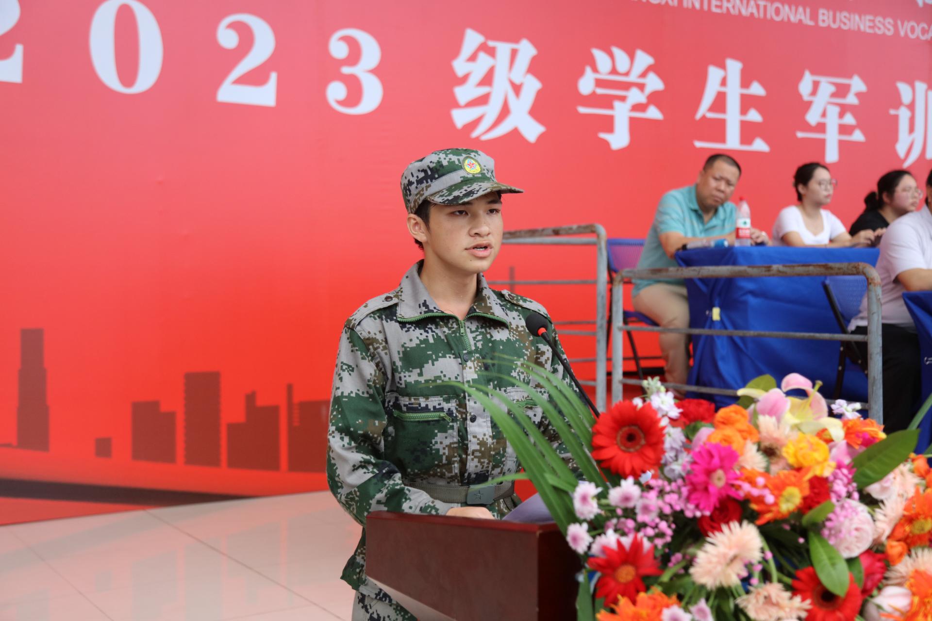智能与信息工程学院的2023级新生杨永发作为学生代表发言。他认为军训作为人生中一次精彩的回忆,在这个过程中有汗水和疲惫,但更多的是成长、友谊和集体凝聚力,因此短暂的军训不仅是对体力的挑战,更是对内心的锤炼。最后他表示在未来的大学生活里,将继续坚持军训中的好习惯,把军训中吃苦耐劳、坚持不懈的精神带到学习、生活中,严格要求自己,努力成为一名优秀的国商学子。