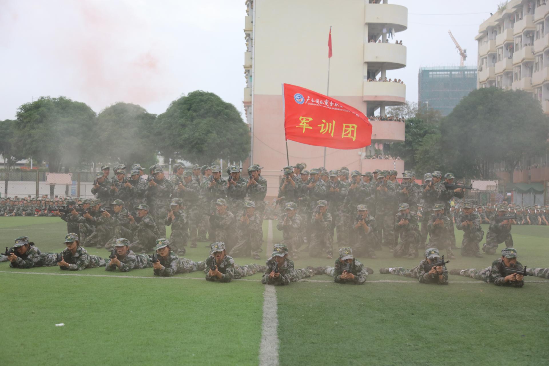 以青春之热血,护国旗之荣光!伴着激昂雄壮的国歌,五星红旗冉冉升起,2600余名参训学生整齐列队,以饱满的姿态迎接总结表彰大会的开幕。随后在校旗的引领下分列式阅兵汇演正式开始,身着迷彩服的国商学子,意气风发、步履铿锵,英姿飒爽、斗志昂扬,5个参训学生方队踏着铿锵有力的步伐,喊着清脆嘹亮的口号依次经过主席台,展现了2023级新生良好的精神风貌。