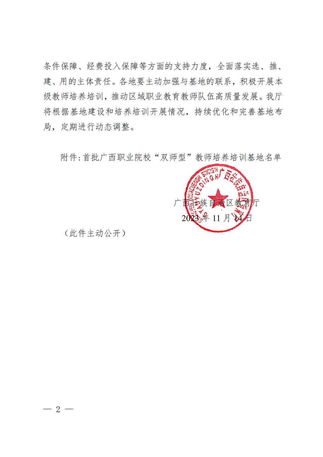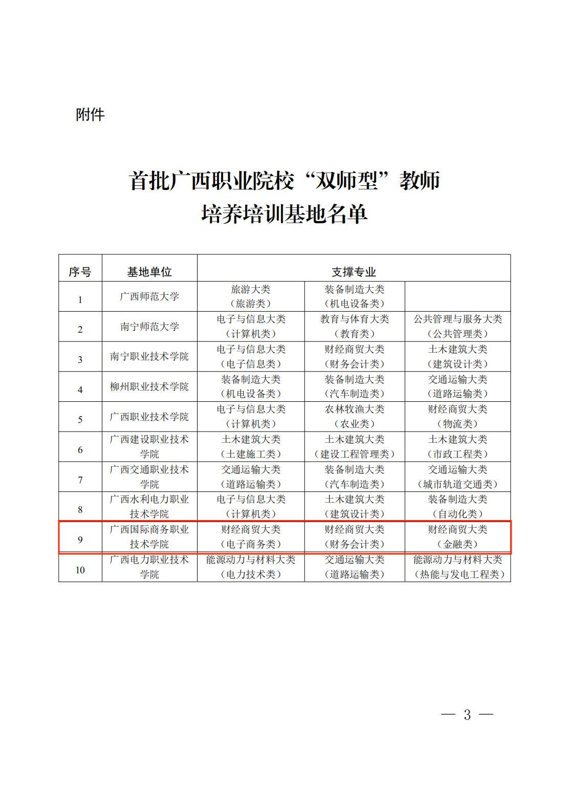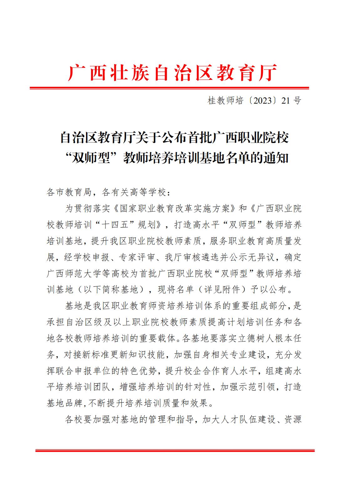 近日,自治区教育厅印发《自治区教育厅关于公布首批广西职业院校“双师型”教师培养培训基地名单的通知》(桂教师培〔2023〕21号),经专家评审、自治区教育厅审核遴选并公示无异议后,我校被确定为首批广西职业院校“双师型”教师培养培训基地(以下简称“基地”),电子商务类、财务会计类、金融类三个专业为基地重点支撑专业。