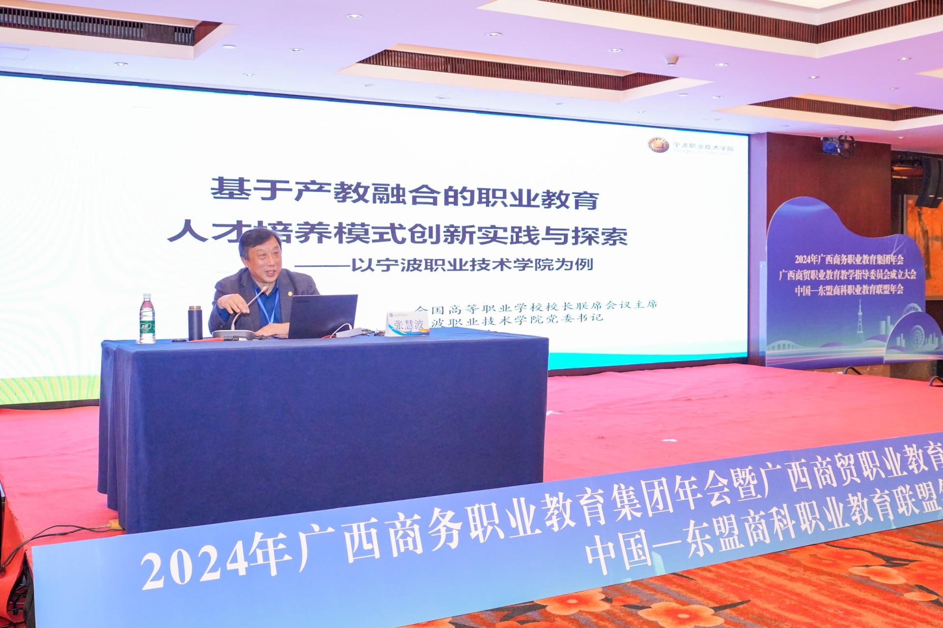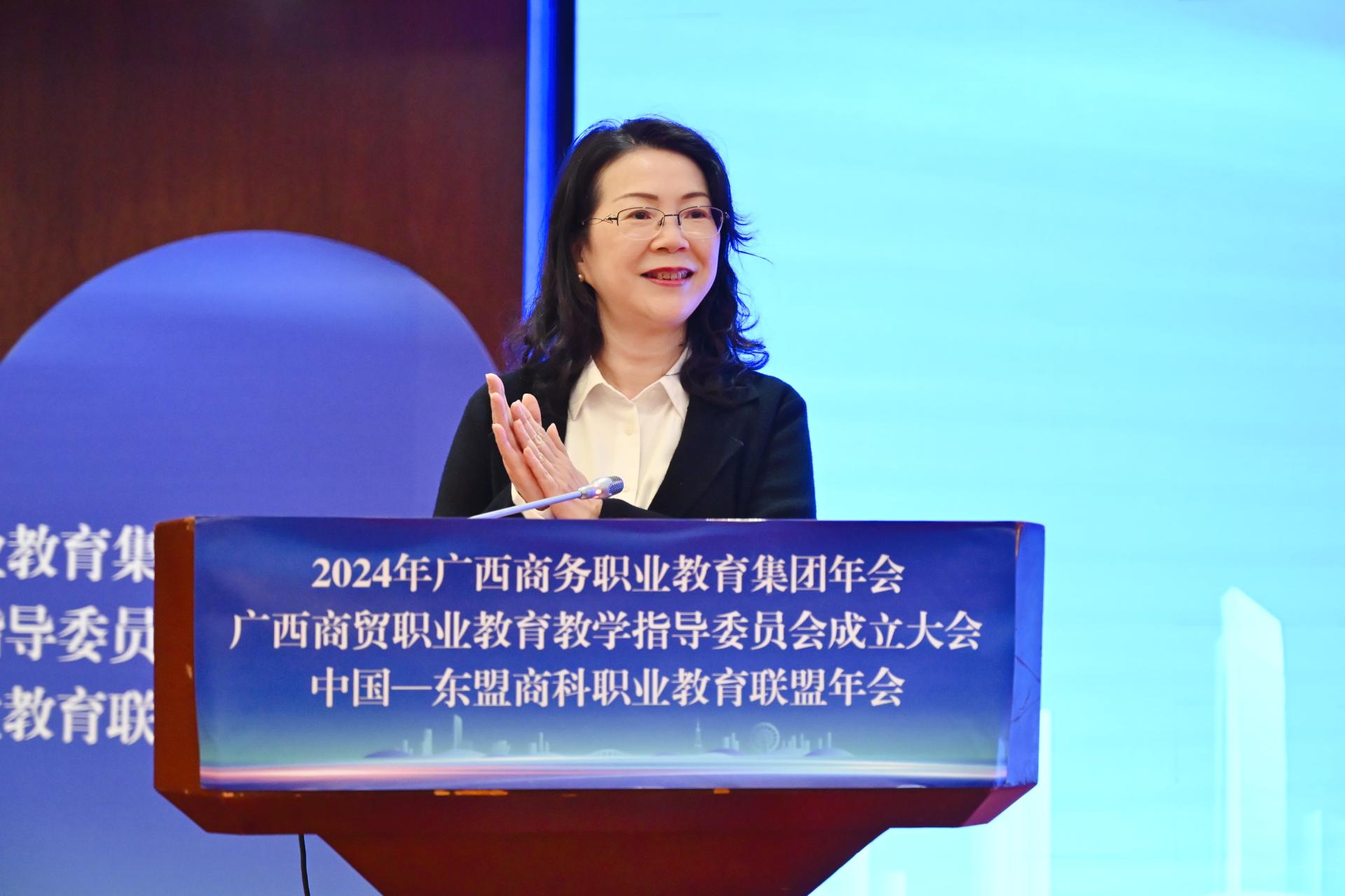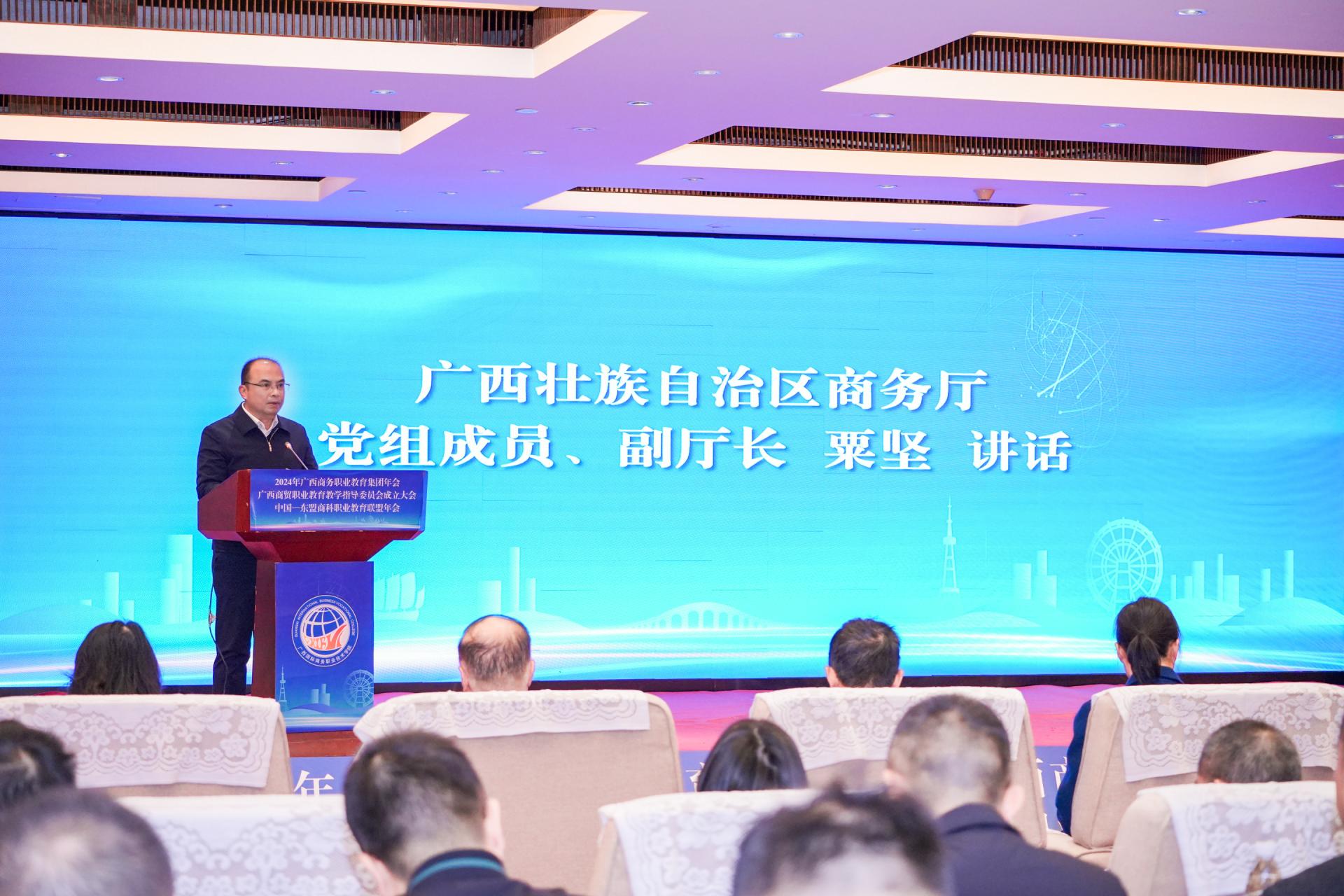 自治区商务厅副厅长粟坚则充分肯定广西商务职业教育集团、中国—东盟商科职业教育联盟在教育质量提升、人才培养模式创新、实训基地建设等方面取得的显著成效。他向职教集团、商科联盟和商贸教学指导委员会提出三点希望:一是围绕发展大局,培养高素质技能型人才;二是深化产教融合,推动校企合作取得新突破;三是加强交流合作,提升职业教育国际化水平。在围绕建设“一区两地一园一通道”,构建面向东盟的跨境产业链、供应链、价值链方面贡献力量。
