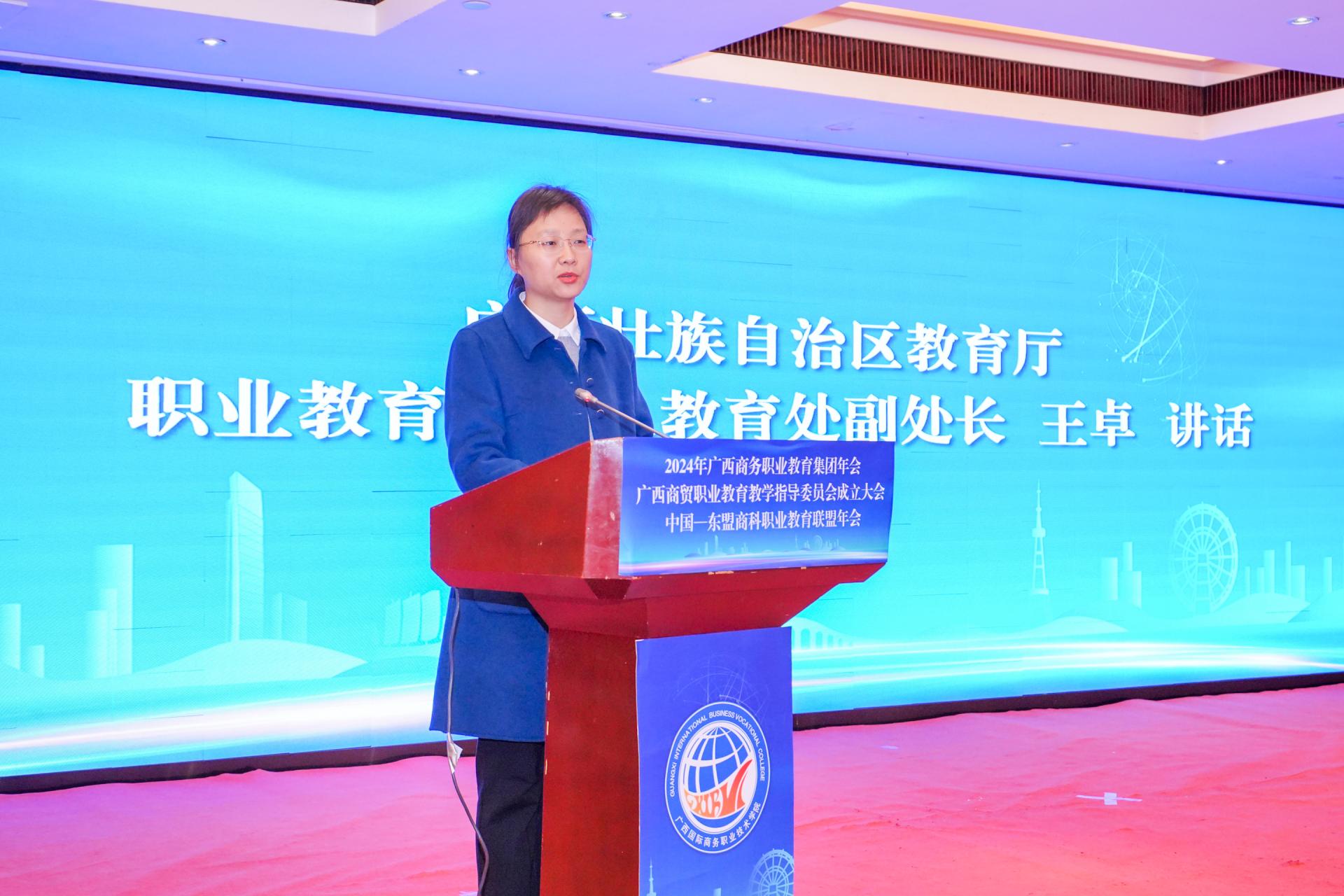 王卓在讲话中高度肯定了广西商务职业教育集团和中国—东盟商科职业教育联盟自成立以来,在深化产教融合、指导专业课程建设、推动商贸职业教育改革发展等方面发挥的重要作用。她希望广西商务职业教育集团、中国—东盟商科职业教育联盟以及广西商贸职业教育教学指导委员会要深化多方合作,实现资源共享、优势互补;推动改革创新,深化职业教育内涵建设;发挥引领作用,为广西职业教育的改革探索有益经验。