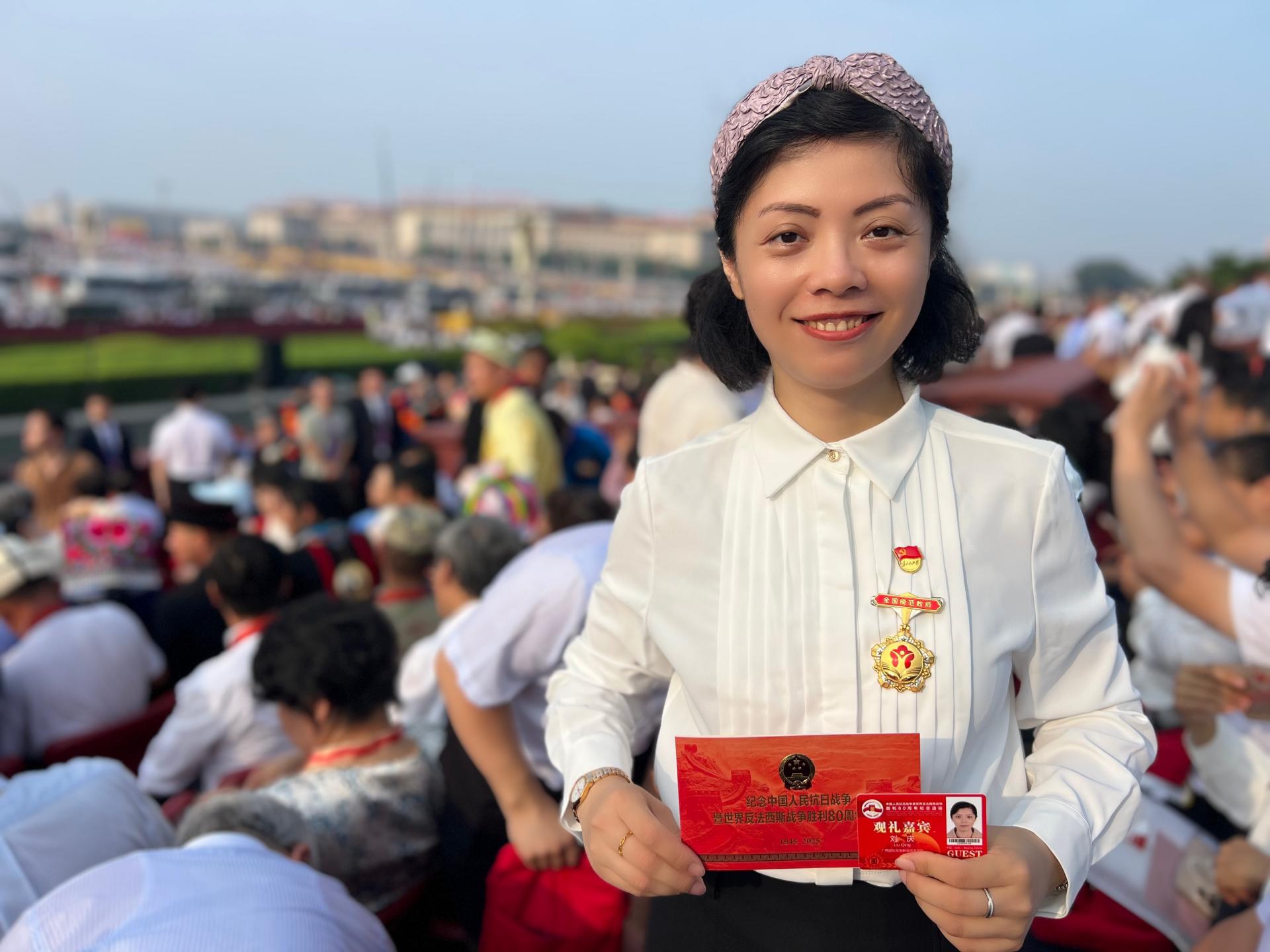 活动结束后刘庆表示:“现场见证国家盛典,我倍感光荣!无数先烈用热血和生命为我们换来了今日的和平盛世,强大的祖国给了我们足够的底气。我要将现场感受到的激动与自豪传递给我的学生们,让他们铭记历史、缅怀先烈、珍惜当下。我将继续深耕教学,坚定潜心育人、传承工匠精神的信念,用实际行动践行‘躬耕教坛,强国有我’的誓言,为培养更多知礼、精技、热爱中华文化的旅游人才贡献力量,助力文旅事业高质量发展,为学校高质量发展、职业教育进步与国家建设贡献更多力量。”