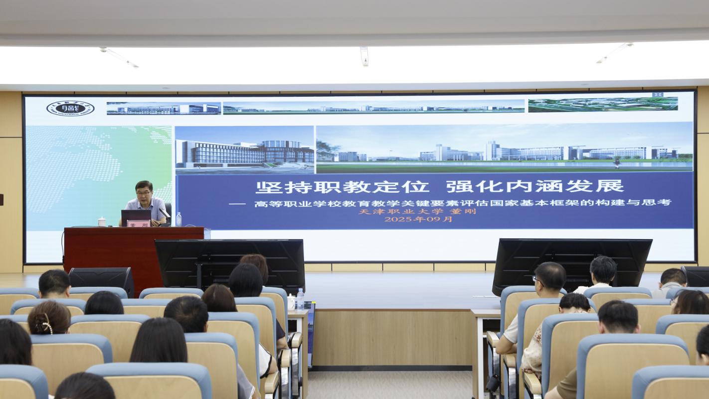 为深入贯彻落实教育部《高等职业学校办学能力评价实施方案(2025—2030年)》精神,精准把握职业教育发展新方向,系统推进学校教育教学改革与内涵建设,近日,我校成功举办“坚持职教定位 强化内涵发展——高等职业学校教育教学关键要素评估国家基本框架的构建与思考”专题讲座。本次讲座邀请了著名职业教育专家、原天津职业大学校长董刚教授担任主讲嘉宾。教务科研处、发展规划与质量管理处等职能部门和学校十一个二级学院负责人及教师代表共计200余人到场聆听学习。讲座由副校长赵迪琼主持。