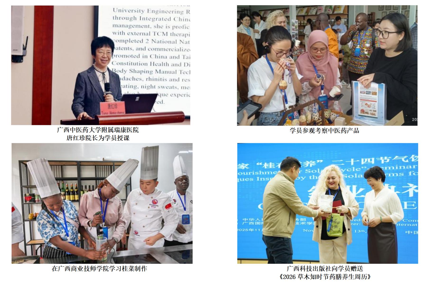 在广西中医药大学附属瑞康医院、玉林市中医药产教联合体、广西商业技师学院以及广西出版社的大力支持下,研修班以节气文化为平台,以药膳技艺为媒介,实现了跨语言交流的深度互通。学员们通过现场观摩与动手实践,近距离感受了“药食同源”“天人合一”的中医理念,也亲身体验了正骨、针灸、推拿等传统疗法,深入了解了广西民族医药与玉林“香都”“药都”产业的发展脉络,有效推动了广西大健康产业的国际传播力与知名度提升。为发展中国家搭建了文化互鉴与民心相通的新平台,进一步彰显了“各美其美,美美与共”的人文精神。