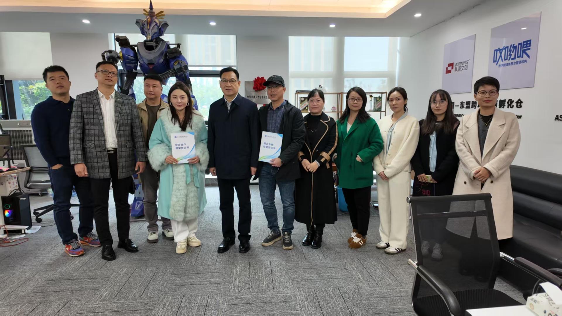 为深化产教融合、推动校企合作,11月19日,我校党委副书记、纪委书记甘忠、应用外国语学院党总支书记李冬华一行赴广西辫子文化传媒有限公司进行交流洽谈,双方正式签署校企合作协议并举行“合作共建人才培养实践教学基地”挂牌仪式。