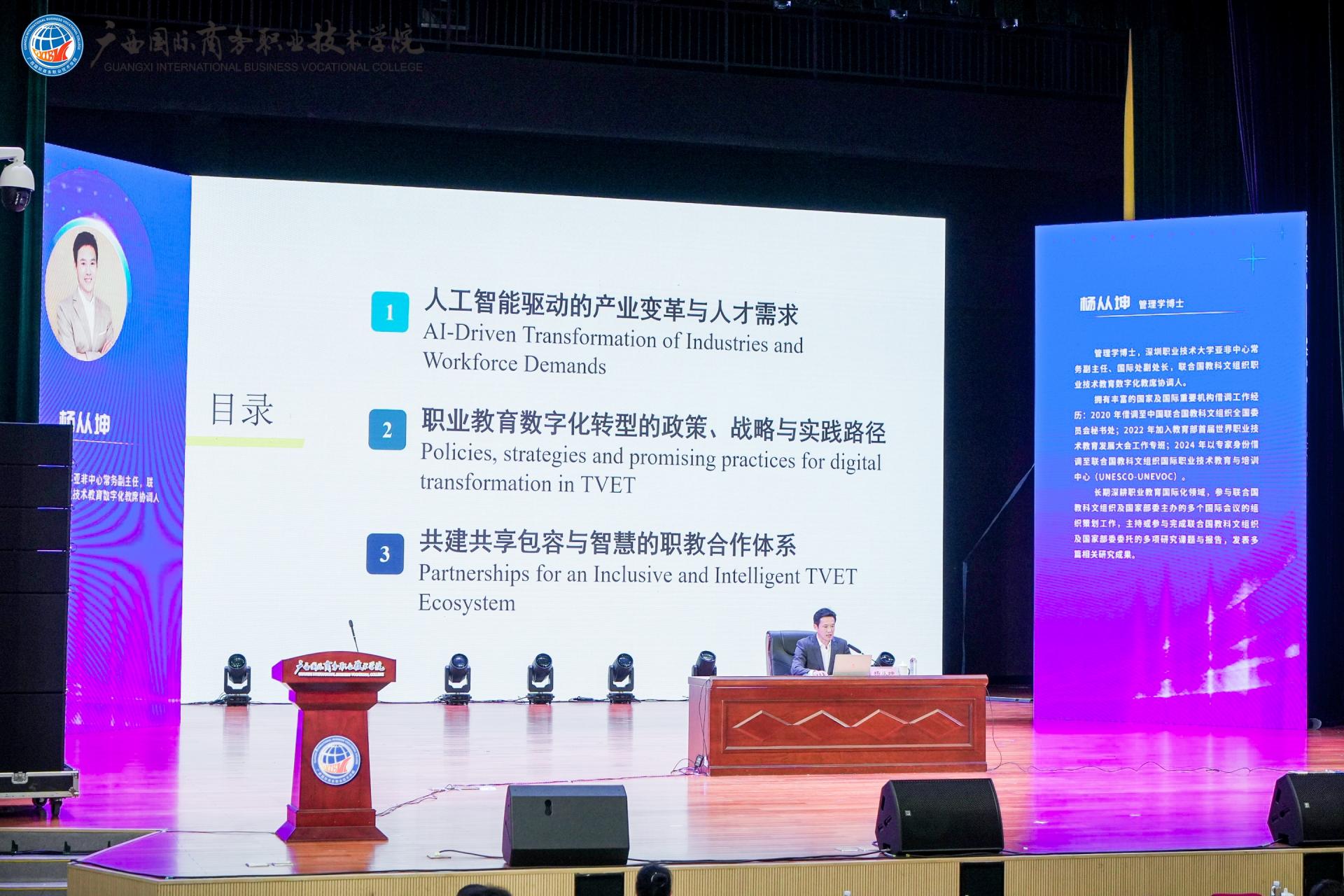 随后,联合国教科文组织职业技术教育数字化教席协调人杨从坤为我们带来了《数字化赋能·国际化引领:职业教育高质量发展的转型路径与全球合作》主题报告,他围绕“数字化赋能 国际化引领”两大核心,系统阐述了职业教育面临的机遇与挑战以及职业教育高质量发展的转型路径与全球合作新范式。内容聚焦于人工智能驱动的产业变革与人才需求、职业教育数字化转型以及共建共享包容与智慧的职业教育合作体系的实践路径,为培养国际化高素质技术技能人才指明了方向。