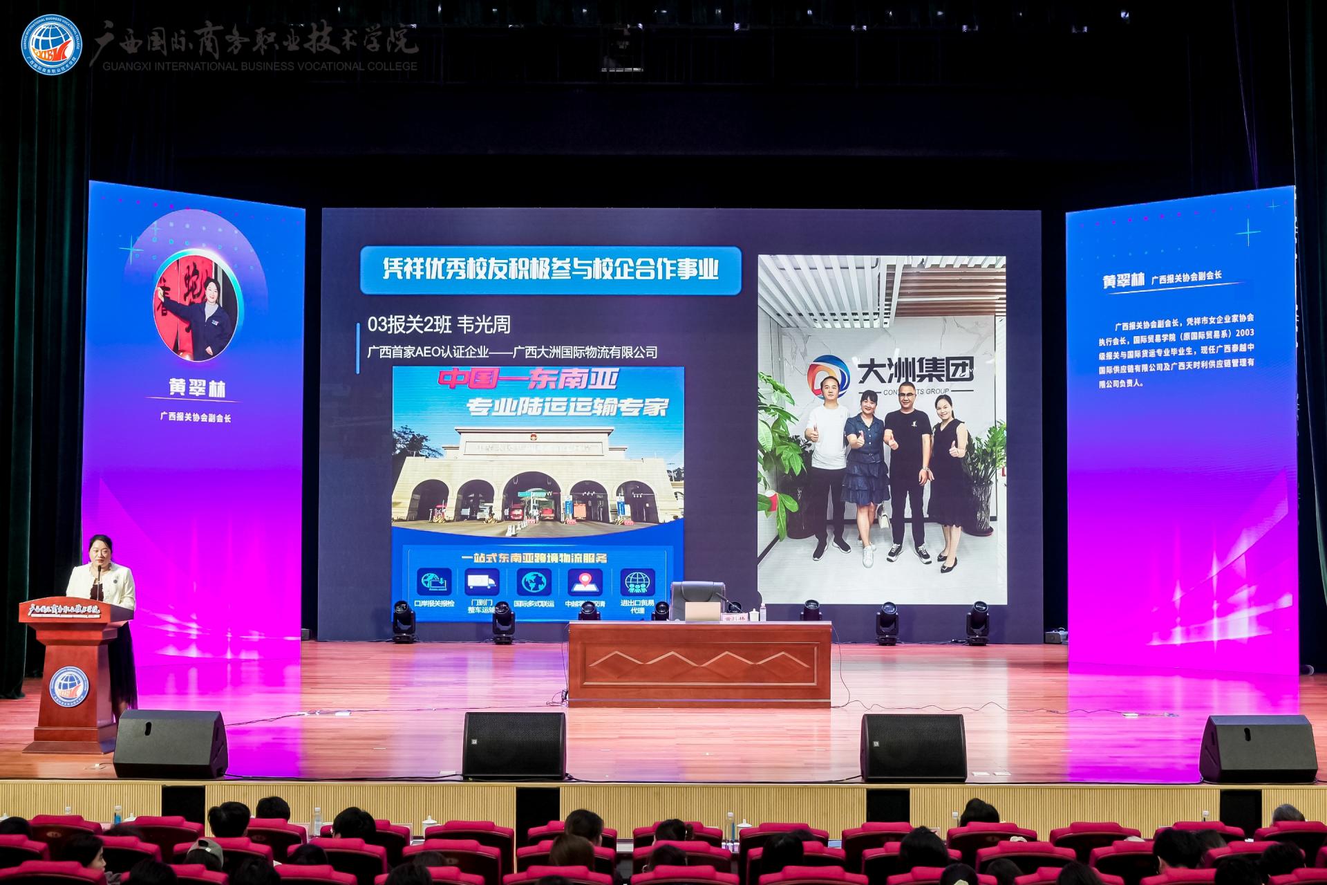最后,我校2003级报关与国际货运专业毕业生、广西报关协会副会长、凭祥市女企业家协会执行会长黄翠林,作《汇聚青年力量,用技能打造无限梦想》主题分享。她以“边境小城启蒙的外贸心”“创业成就梦想启航”等成长故事,讲述了自己从萌生梦想,到深耕边境外贸领域创业,再到投身产教融合、反哺母校的成长经历。其深耕边境贸易的实践,为凭祥边境口岸的外贸经济发展作出了积极贡献。此次分享生动说明,技能既能点亮个人梦想,也能为边境贸易发展提供助力。同时也启示我们,扎实的专业能力搭配坚定的职业理想,能为个人职业发展和行业进步发挥作用,青年一代的成长价值,体现在立足所学专业、深耕职业领域的坚守与奋进之中。