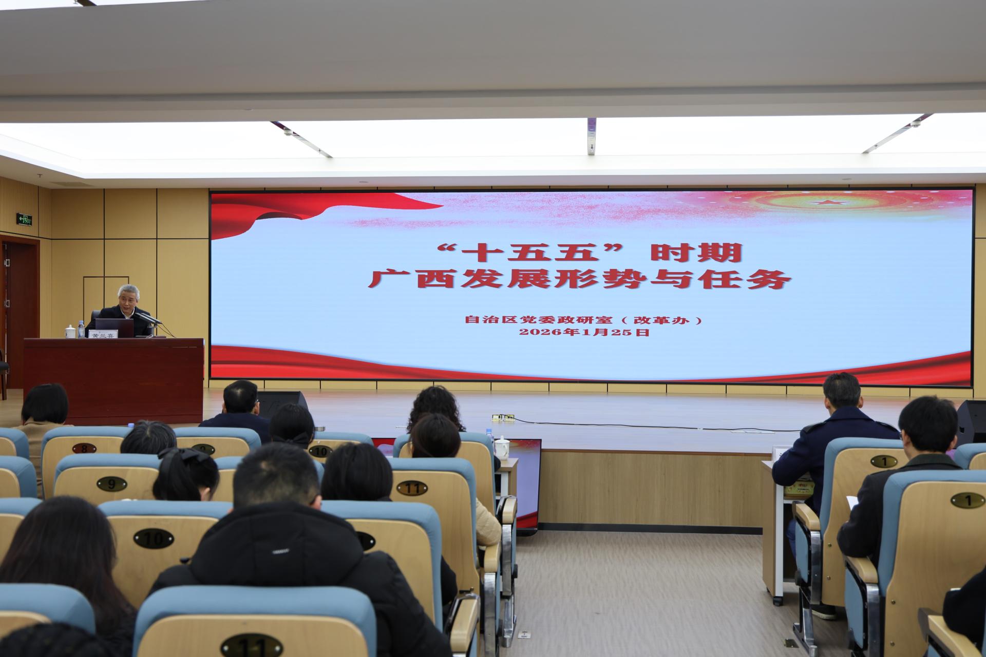 1月25日,两场高质量专题讲座接连开讲。自治区党委副秘书长、政研室(改革办)主任黄兰喜同志,以深厚的政策研究功底和宏观的政策视野,对我区“十五五”规划建议的战略背景、核心目标与重点任务,进行了系统透彻、精辟深刻的解读,为学员们作了一场高水平、极具针对性的专题辅导。杭州职业技术大学研究员许世建博士,以职业教育的法律、政策为依据,深刻阐述了职业教育教学改革的本质及关键举措,为我们落实国家新双高计划,推动集群培养进行了辅导。
