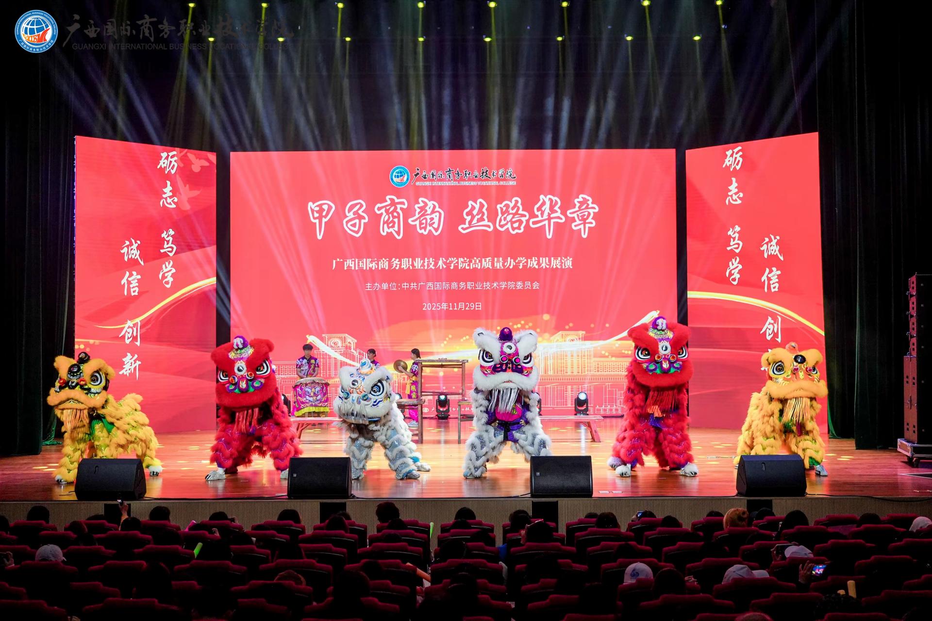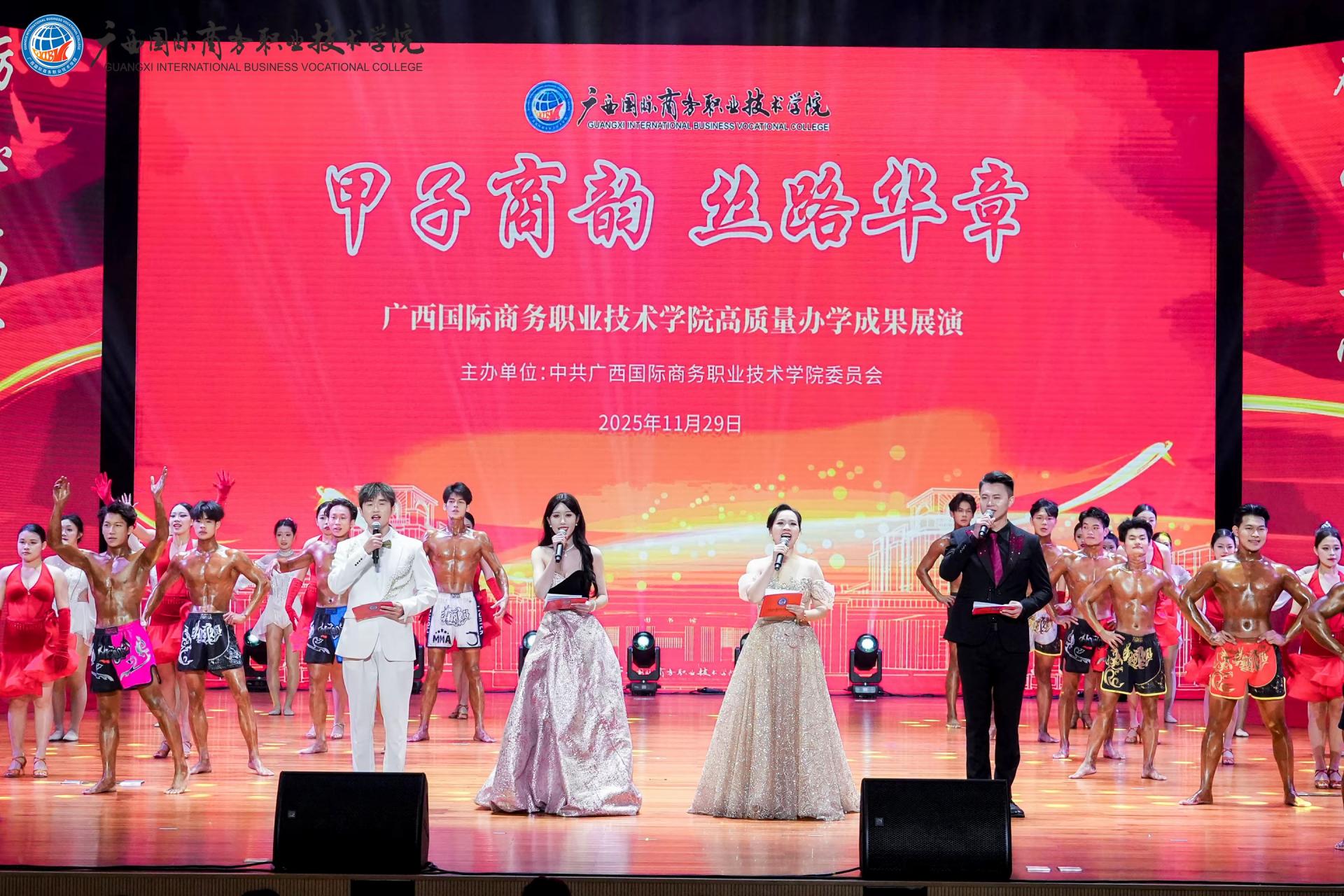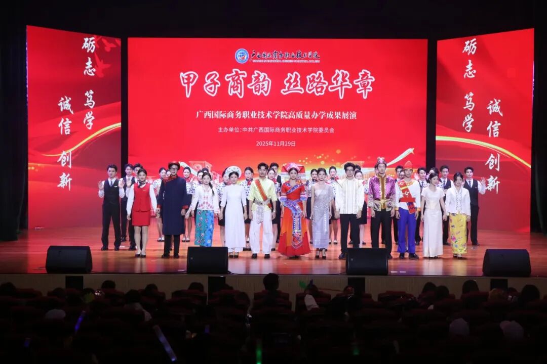 2025年11月29日晚,我校在东盟校区聚学堂成功举办“甲子商韵·丝路华章”高质量办学成果展演。同时,东盟校区足球场、大学路校区东盟广场设置分会场现场直播,学校视频号、抖音号线上直播,让全校师生、海内外校友及社会各界人士共同见证这一璀璨时刻。350余名师生校友倾情参演,奏响了一曲“产教融合、开放共赢”的时代交响。