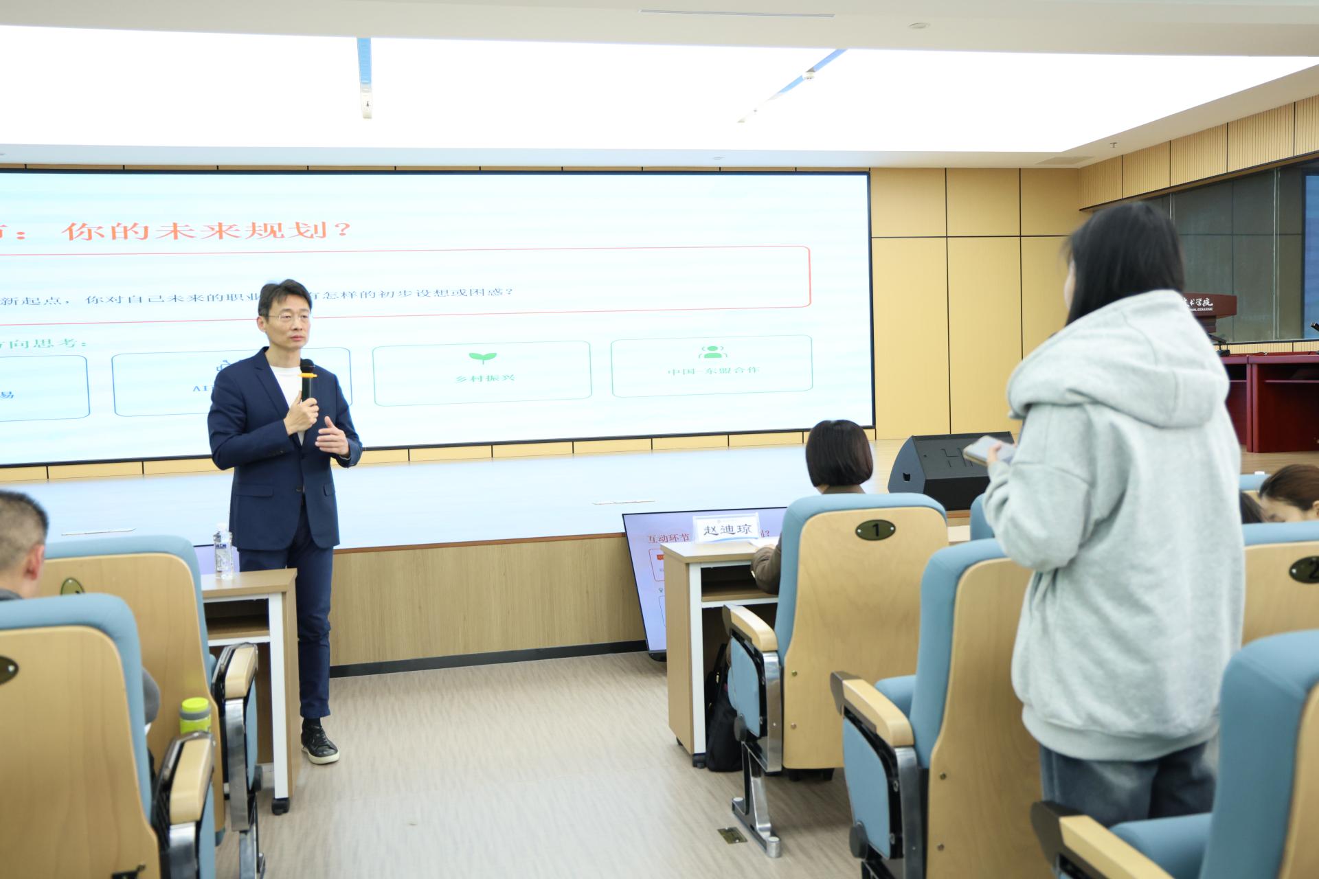 互动交流环节成为本次“开学第一课”的一大亮点。课堂上,学子们踊跃举手、积极提问,围绕东盟实践参与、学业与创新创业平衡、数字化技能提升、职业规划制定等成长困惑向校领导请教。校领导结合学校办学特色、区域发展需求和青年成长规律进行细致解答,为学子拨开成长迷雾、明晰奋斗方向,现场掌声阵阵、气氛热烈,形成了教学相长、双向奔赴的良好氛围。