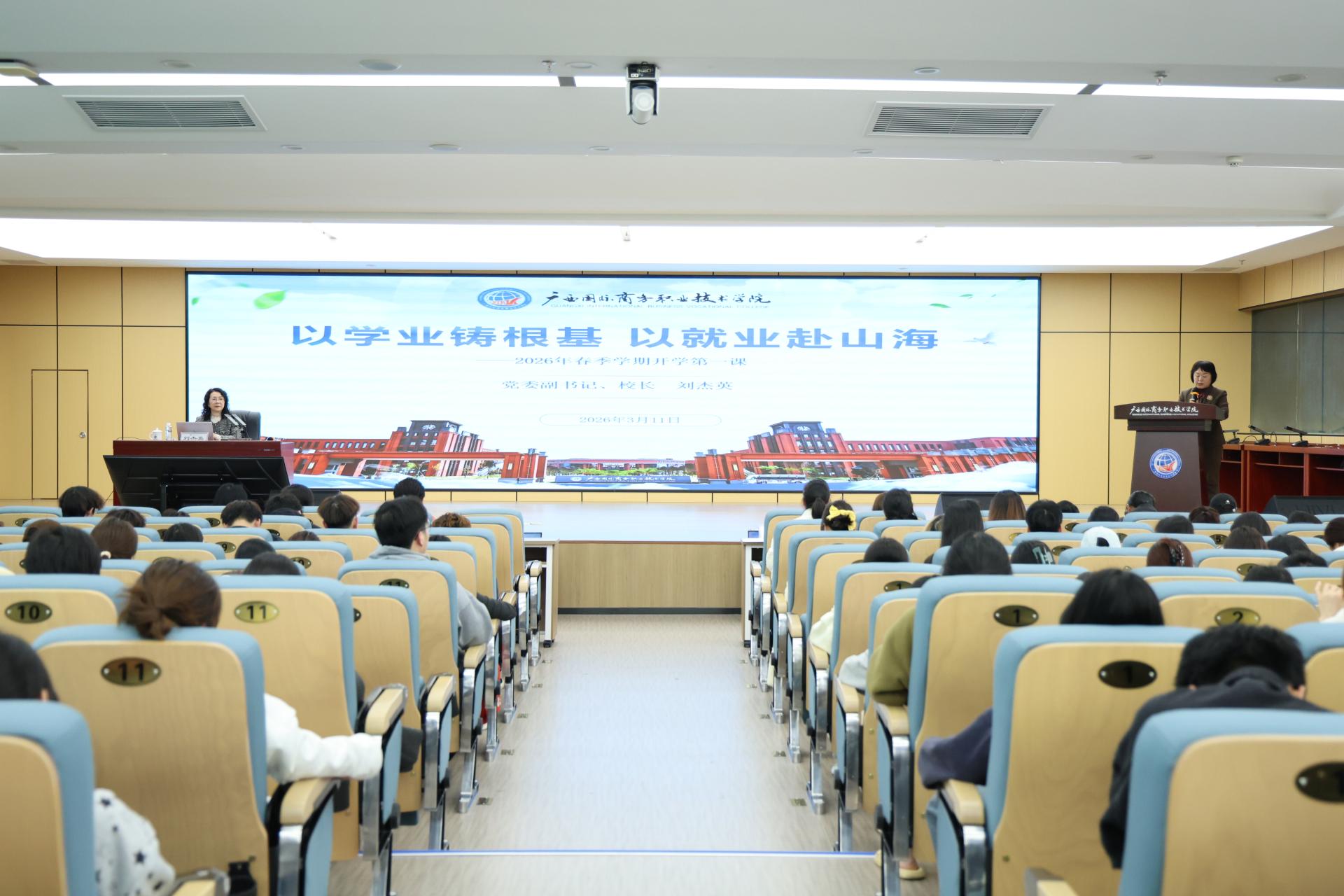 春潮澎湃启新程,奋楫扬帆向未来。3月11日,我校2026年春季学期“开学第一课”在大学路校区、东盟校区开讲,学校党委书记汪述斌、党委副书记、校长刘杰英分别为全校思政课教师、辅导员代表及2025级学生代表1200余人带来一堂兼具思想高度、理论深度与实践温度的“大思政课”。课程紧扣“十四五”圆满收官、“十五五”扬帆起航的历史节点,立足学校“服务国家战略、助力区域发展”的办学使命,结合职业教育特色与学生成长需求,将国家发展、区域建设与青年成长紧密联结,为青年学子校准人生坐标、注入奋进动能。“开学第一课”由副校长赵迪琼主持。
