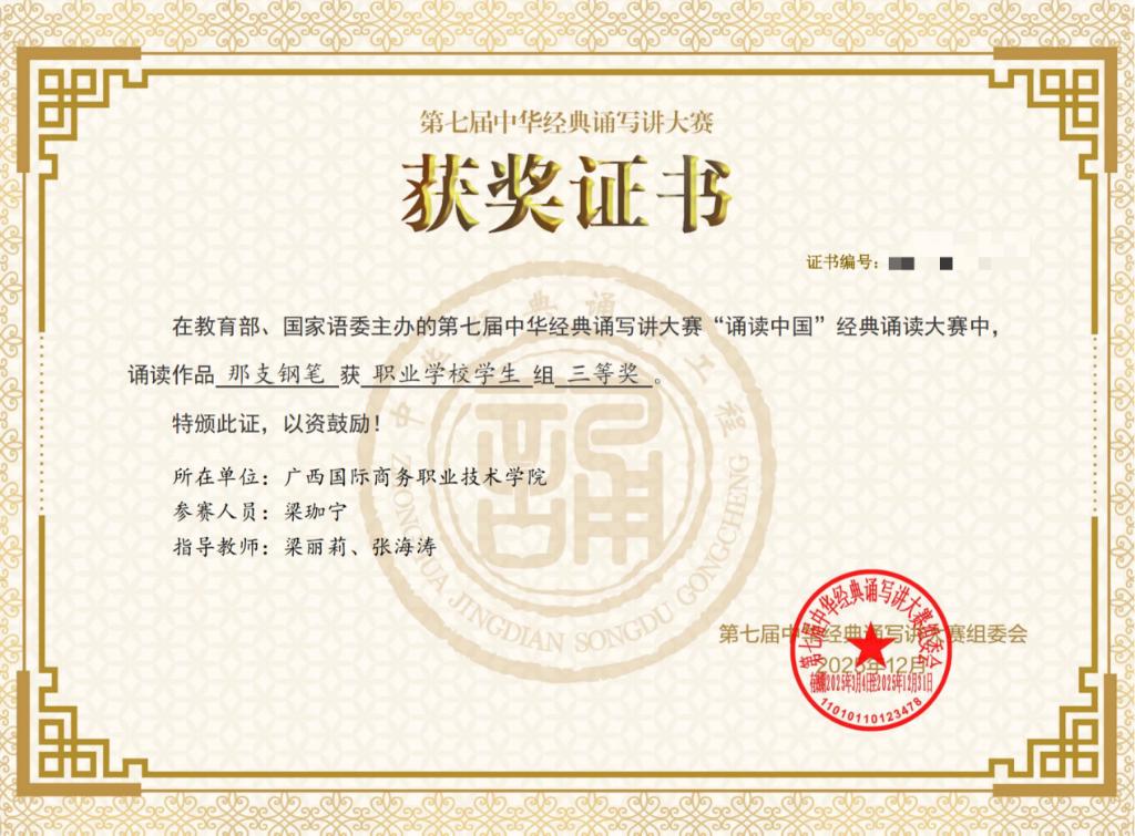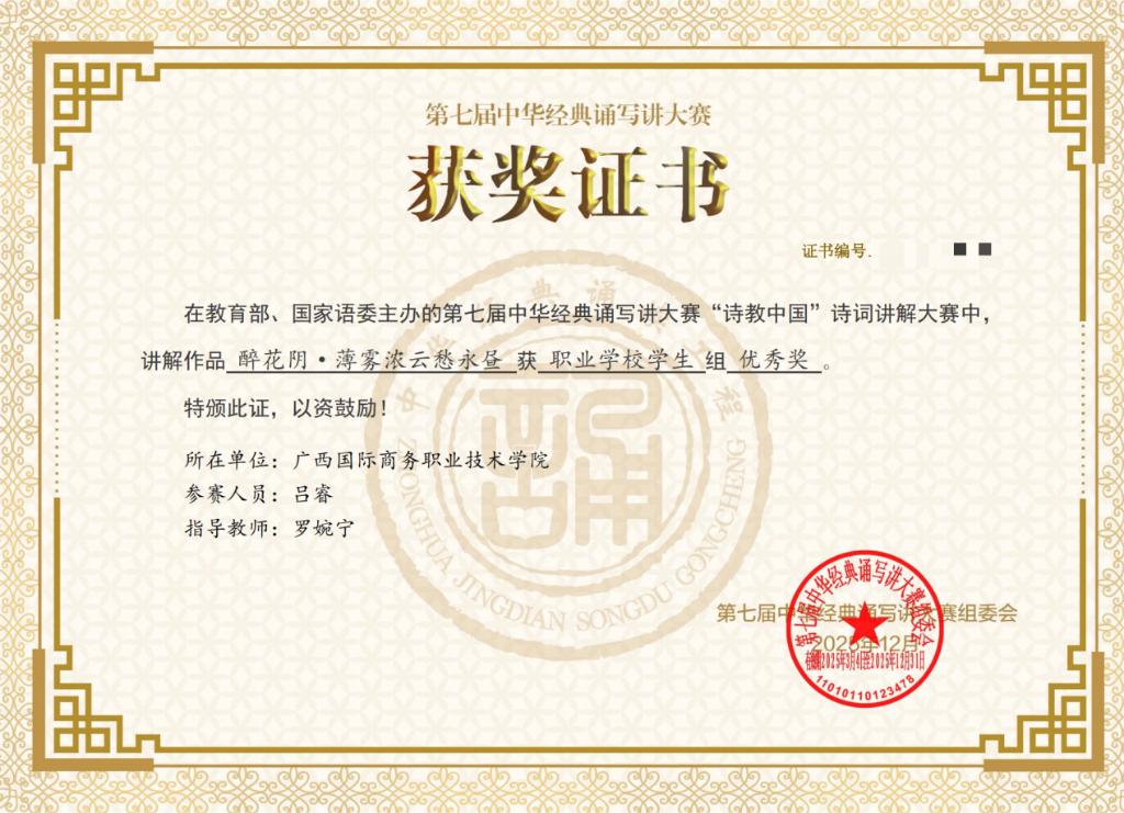 本届大赛以“典耀中华,赓续文脉”为主题,旨在传承中华优秀语言文化、推广国家通用语言文字,吸引了全国各级各类学校师生踊跃参与,参赛规模突破两千万人次,竞争激烈。据统计,大赛共有547万余件作品入围初赛,经过复赛与决赛的激烈角逐,“诵读中国”经典诵读大赛最终评选出获奖作品2789件,“诗教中国”诗词讲解大赛评选出获奖作品1904件。我校现代流通学院23级商务管理2班梁珈宁同学在“诵读中国”经典诵读大赛中表现突出,荣获职业学校学生组三等奖;人工智能学院24级软件5班吕睿同学在“诗教中国”诗词讲解大赛中稳步发挥,荣获职业学校学生组优秀奖。这两项荣誉的背后,既是学子们刻苦钻研与指导教师悉心付出的结果,更是我校坚持“以美育人、以文化人”理念、深耕中华经典的生动体现。
