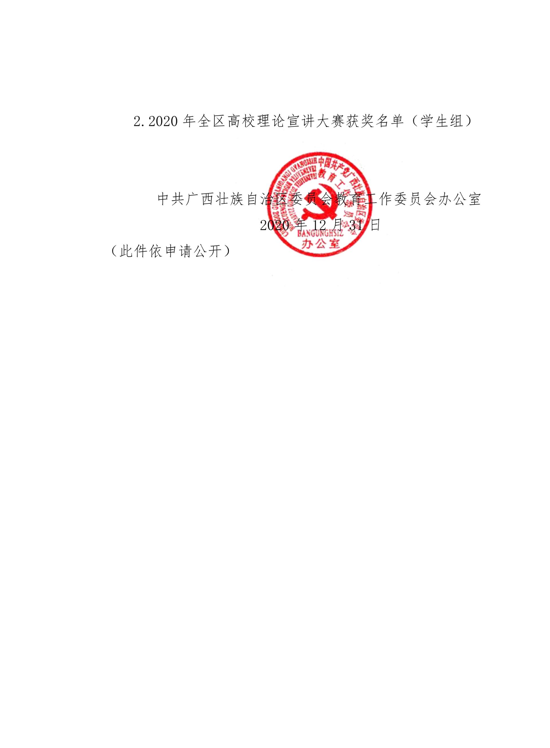 2020年4月至6月,由自治区党委宣传部主办的全区理论宣讲比赛在广西南宁举行。我院国际贸易系教师王廖莎、公共基础教学部教师梁建南分别荣获三等奖,招生就业处教师刘海新、学生工作处教师刘洁及应用外语系教师庞海波分别荣获优秀奖。