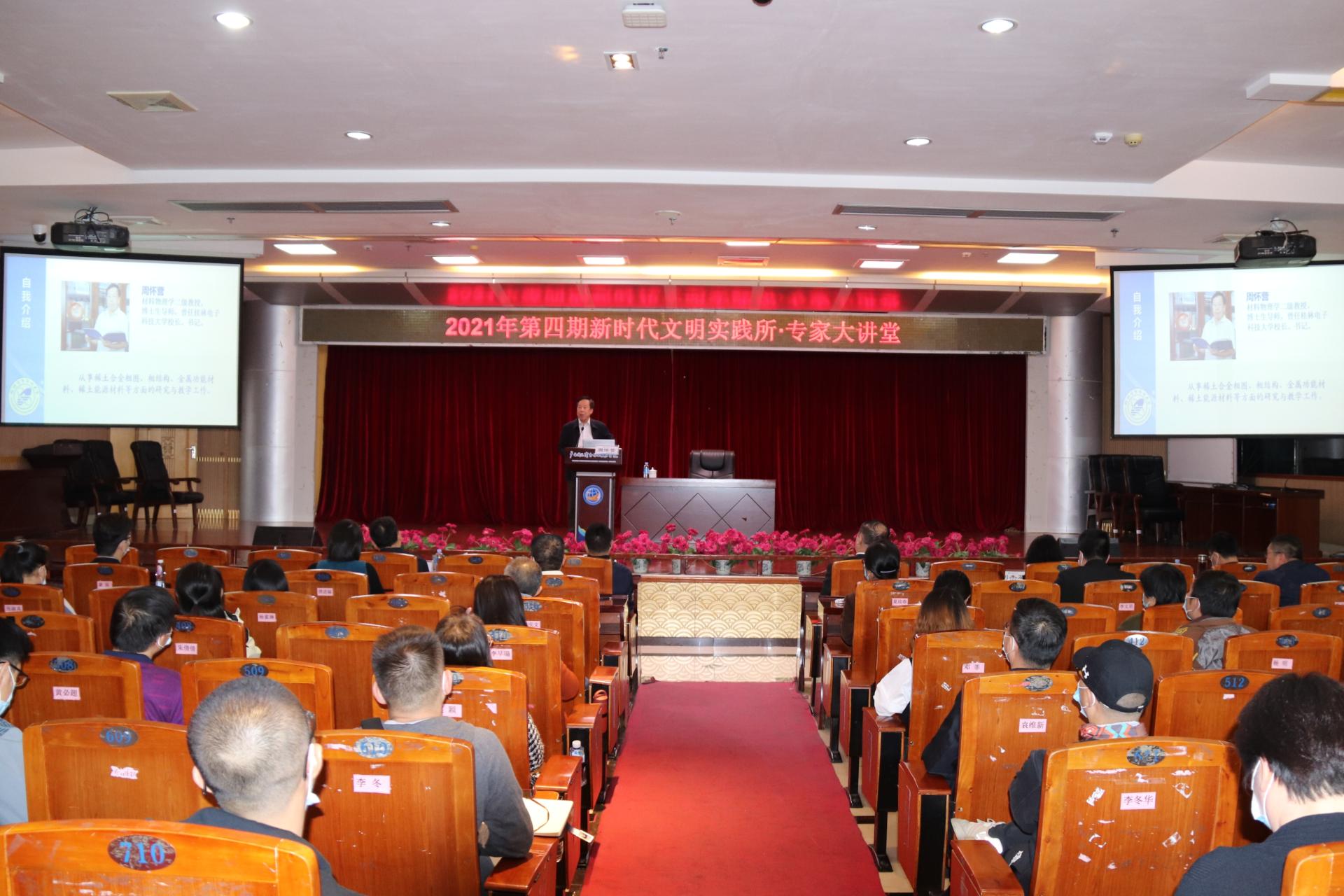 为深入学习贯彻习近平总书记“七一”重要讲话精神,推动学校党史学习教育走深走实,强化我校各级领导干部责任担当和开拓创新意识,不断提升大家干事创业的精气神,推进学校各项事业高质量发展,学校于11月9日下午在图书馆11楼学术报告厅,举办了2021年第四期新时代文明实践所·专家大讲堂,邀请自治区党委党史学习教育第十五巡回指导组组长、桂林电子科技大学原党委书记周怀营教授为我们作《领导干部执行力提升》专题讲座。学校党委书记谢云、党委副书记青增计,学校党委委员、副校长刘杰英,党委委员、纪委书记甘忠,副校长蒋百平出席,学校中层干部、三层机构负责人等近100人参加。讲座由谢云主持。