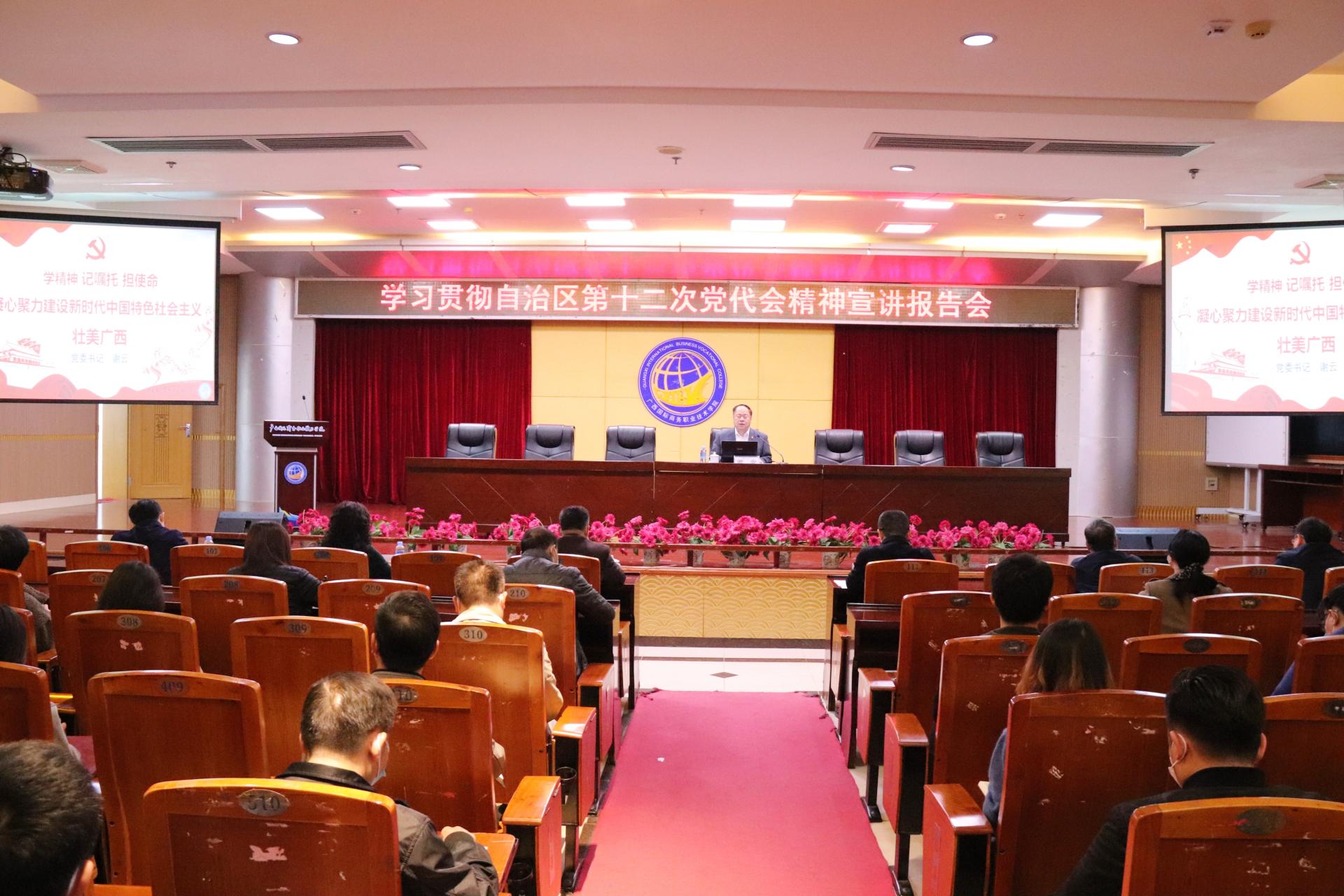 根据自治区党委、自治区党委教育工委部署要求,为深入学习贯彻自治区第十二次党代会精神,切实把全校师生的思想统一到党代会精神上来,实现学校各项事业的高质量发展,2022年1月7日下午,我校在图书馆11楼学术报告厅召开学习贯彻自治区第十二次党代会精神宣讲报告会。学校党委书记谢云以《学精神 记嘱托 担使命 凝心聚力建设新时代中国特色社会主义壮美广西》为题作宣讲报告。报告会由党委副书记、校长王国红主持。
