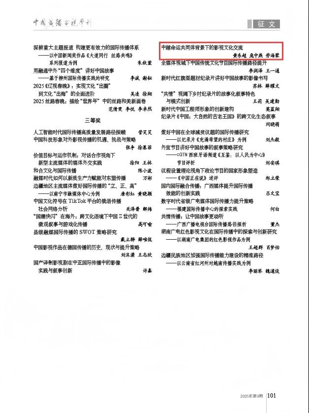 近日,由国家广播电视总局国际合作司、中国广播电视社会组织联合会、广西广播电视台联合主办,《中国广播电视学刊》编辑部承办的第五届广西视听杯“加强国际传播能力建设、促进文明交流互鉴”主题征文活动评选结果正式揭晓。我校应用外国语学院教师黄东超、庞中燕撰写的论文《中越命运共同体背景下的影视文化交流》荣获三等奖。