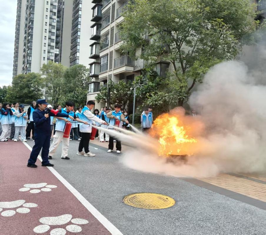 消防工作人员讲解灭火器、消防栓的正确使用方法,以及火灾初期的扑救技巧、火场逃生自救常识等。随后进行正式演练,在工作人员的指导下,同学们用湿毛巾捂住口鼻,弯腰低姿,按照预定疏散路线快速、有序地撤离至安全区。最后,同学们进行灭火实操演练,亲身感受“提、拔、握、压”的灭火步骤,有效提升了应对初期火灾的实际操作能力。
