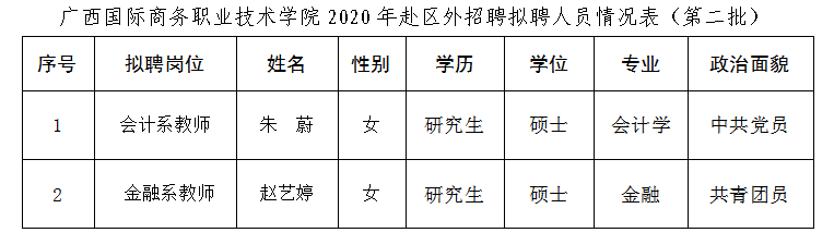 根据《广西国际商务职业技术学院2020年度赴区外招聘急需紧缺高层次人才公告》规定,通过报名、资格审查、面试、考核、体检及学院领导班子集体研究等程序,拟聘用朱蔚、赵艺婷2位同志为我院非实名人员控制数工作人员,现予以公示。公示时间为7个工作日(2021年2月8日—2021年2月22日)。