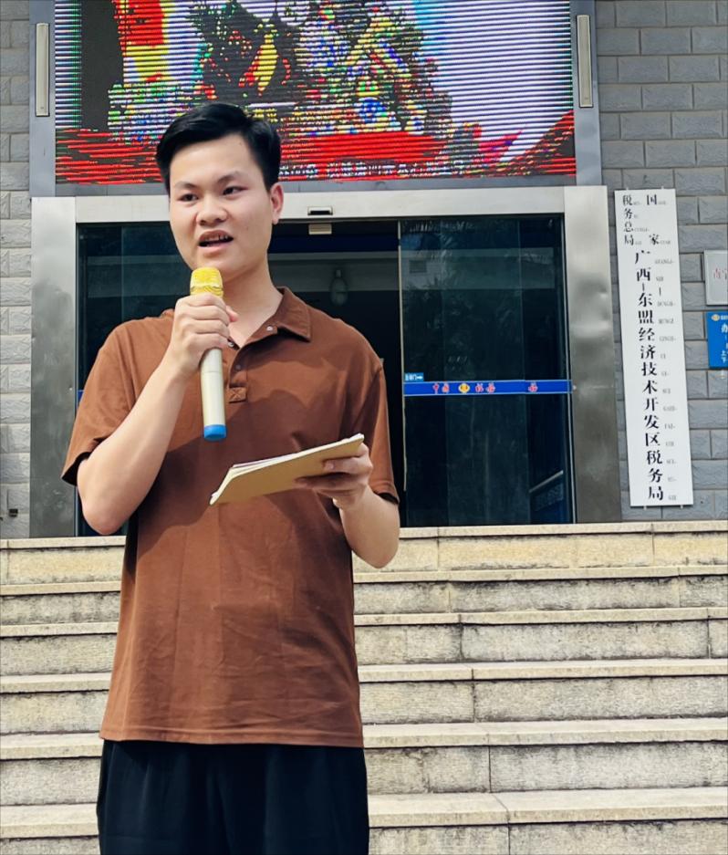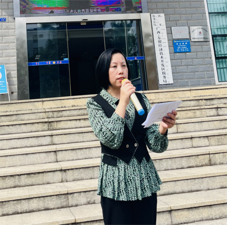 为进一步弘扬雷锋精神,倡导“奉献、友爱、互助、进步”的志愿者精神,扎实推进学雷锋主题月活动,会计学院党总支及教工党支部于3月21日下午组织学校师生与广西-东盟经济技术开发区税务局(以下简称:东盟税务局)联合共建税收志愿服务活动。活动启动仪式在东盟税务局举行。出席本次活动的有东盟税务局党委书记、局长林朝建,纪检组长秦梁权,副局长蒙泯獗、罗晟、李丽丹,以及税务局各部门负责人。会计学院党总支专职副书记王俊雄、副院长李凌、税专业和课程团队的老师以及学生代表参加了本次活动。启动仪式由会计学院院长、教工党支部书记徐爱菲主持。