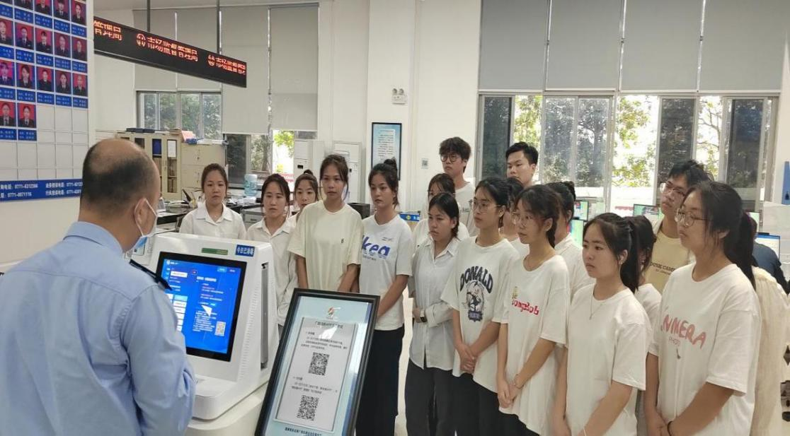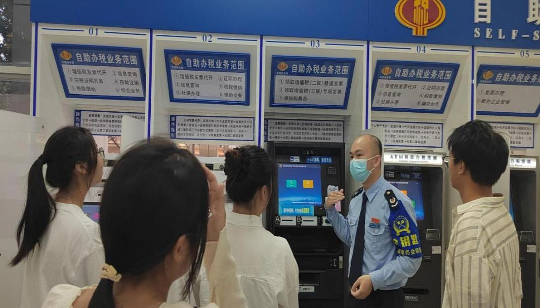 与此同时,由欧阳欣卉、杜金玲老师带队,我校19名学生代表走进办税服务大厅,感受税务文化、学习税收知识、参与税收志愿服务。办税服务厅工作人员带领志愿者们参观办税服务厅的导税区、窗口办理区和自助办税区等不同办税功能区,了解办税的基本内容和流程,为他们细心讲解设备的操作流程,手把手教会他们涉税业务的办理。