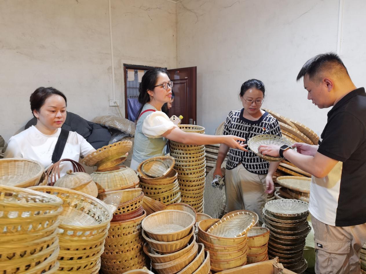 党员同志们欣赏竹编工艺品