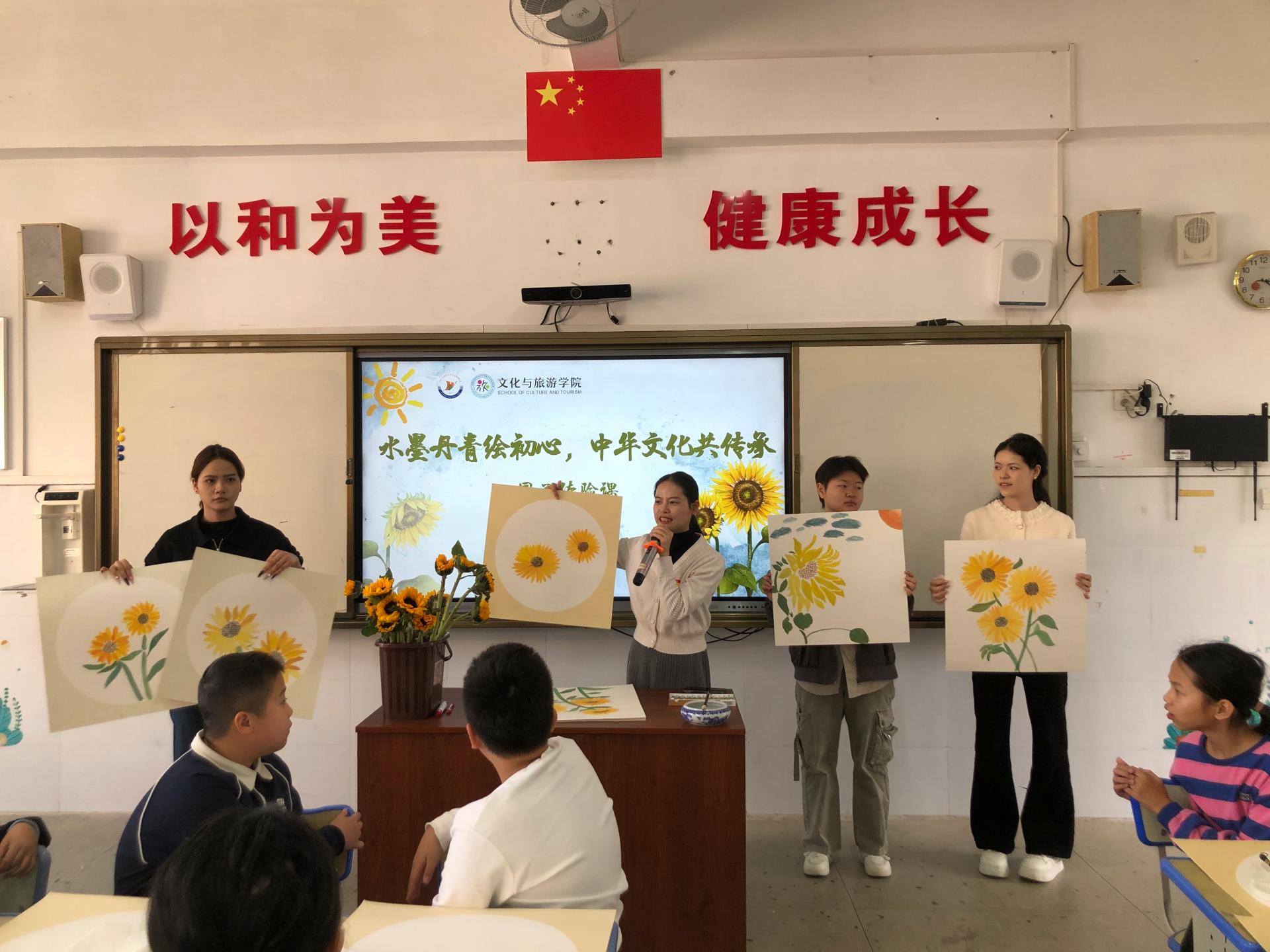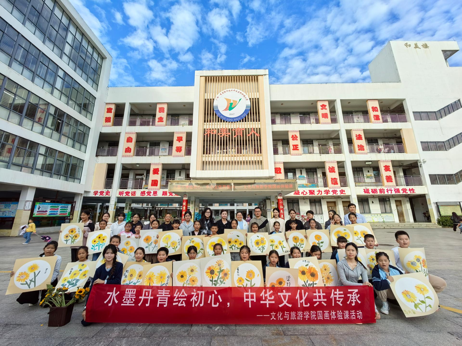 为弘扬中华优秀传统文化,厚植青少年文化自信,同时提升文化与旅游学院学生实践与沟通能力,11月21日下午,文化与旅游学院学生党支部以艺术美育为纽带,搭建“大手牵小手”共学共创的文化交流平台,携手东盟经济开发区致和路小学开展以“向阳而生”为主题的国画体验活动,活动旨在以美育促进代际对话与社群融合,党支部5名党员教师及20名休闲服务与管理、旅游管理专业学生共同参与本次活动。
