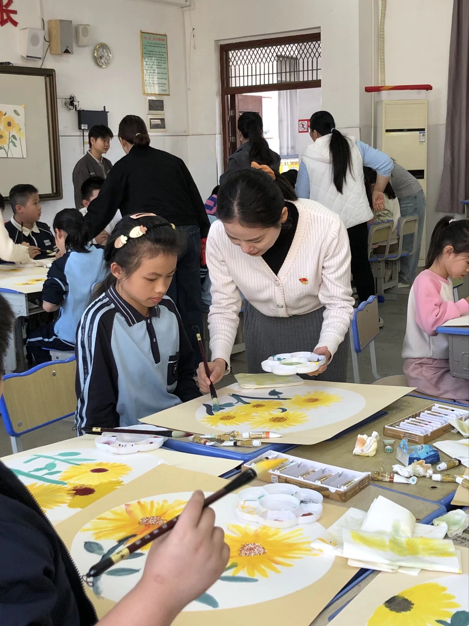 聆听了老师的细致指导后,小学生们在志愿者“一对一”的协助下,纷纷拿起画笔,神情专注地绘制属于自己的一株“向日葵”。很快,一幅幅独具童趣、灵动鲜活的作品悄然诞生。通过亲自动手开展实践,进一步加深了学生们对传统文化的理解和认识。