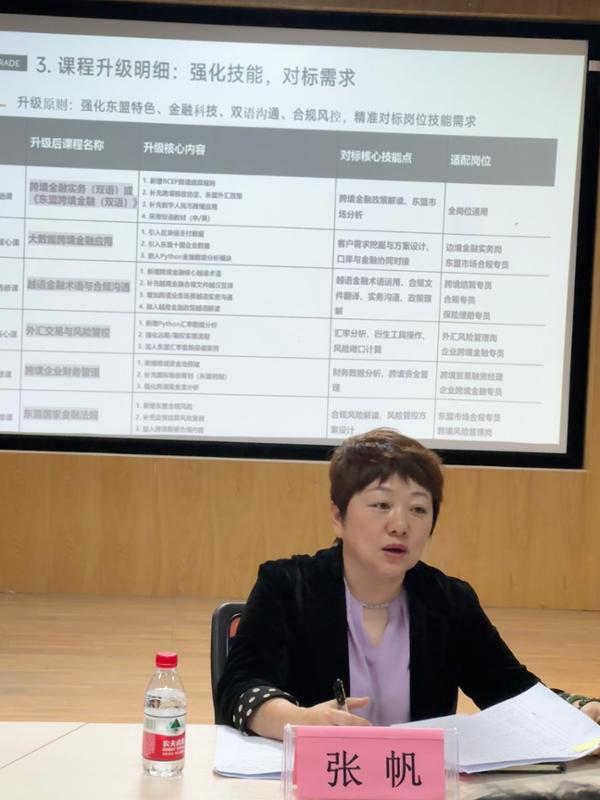 张帆教授聚焦课程体系优化提出指导。她提出,课程设置必须紧密对接职业岗位标准,国际金融专业应重点强化外汇结算、跨境金融服务等实务类课程,适度精简理论冗余模块,大力推行案例教学和项目化教学,构建“理论+实践”一体化课程体系。