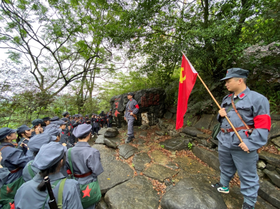 经过1小时40分钟的行程,红七军战士(老师同学们)终于爬到了山顶,到达当年邓小平同志战斗的地点三层岗,迎来了胜利的喜悦。