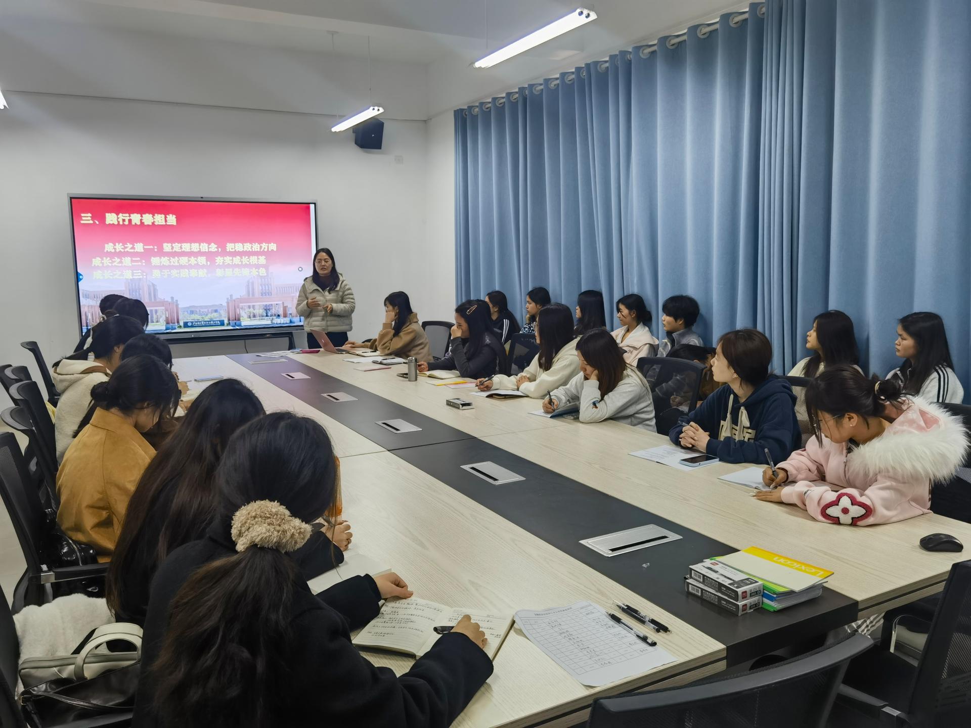 为深入学习贯彻党的二十届四中全会精神,12月30日,学院党总支专职副书记杨爱香以“深学全会精神 勇担时代使命”为题进行了专题党课讲授,本次党课采取线上和线下相结合的方式开展,学生党支部党员和入党积极分子共75人参加了本次学习。