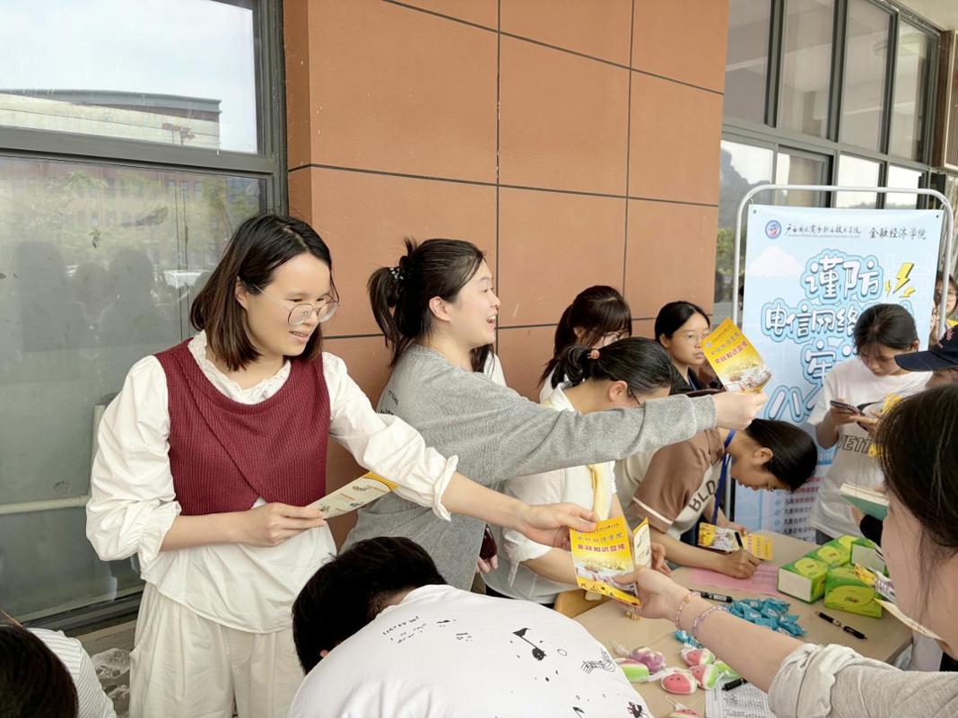 活动现场氛围浓厚、宣传有序。志愿者们主动向过往师生发放反诈宣传资料,结合刷单诈骗、校园贷、冒充客服退款、虚假中奖等校园高频诈骗案例,用通俗易懂的语言细致讲解诈骗常见套路、识别方法和防范技巧。志愿者们充分发挥金融专业优势,提醒大家切勿轻信陌生来电与不明信息,不随意透露个人身份信息、银行卡密码及短信验证码,守住“钱袋子”,从源头防范电信网络诈骗风险。