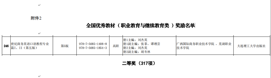 2021年10月12日,国家教材委员会发布《关于首届全国教材建设奖奖励的决定》,我校刘杰英副校长主编的《世纪商务英语口语教程专业 篇I、II(第五版)》教材,获得全国优秀教材 (职业教育与继续教育类 )二等奖。