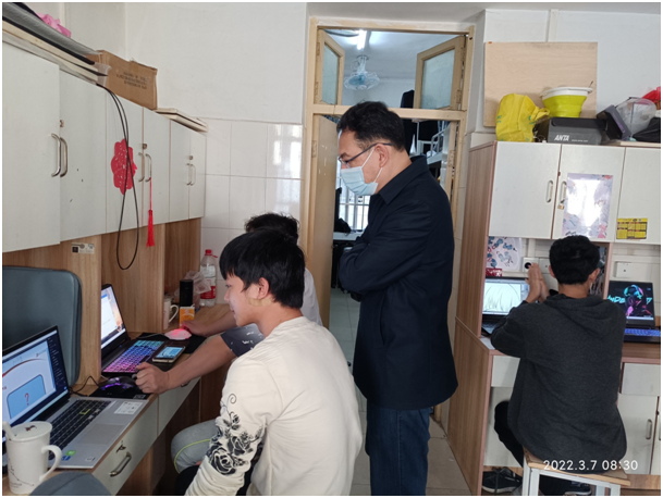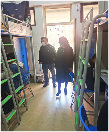 随后,在学校领导带领下,各组分别前往学生宿舍,了解学生在宿舍线上学习情况,并与学生亲切交流。学校领导勉励同学们一定按照学校疫情防控相关要求,充分利用信息化手段,积极发挥学习的主观能动性,优质高效完成线上学习任务,保障学生线上学习与线下复习有效衔接。
