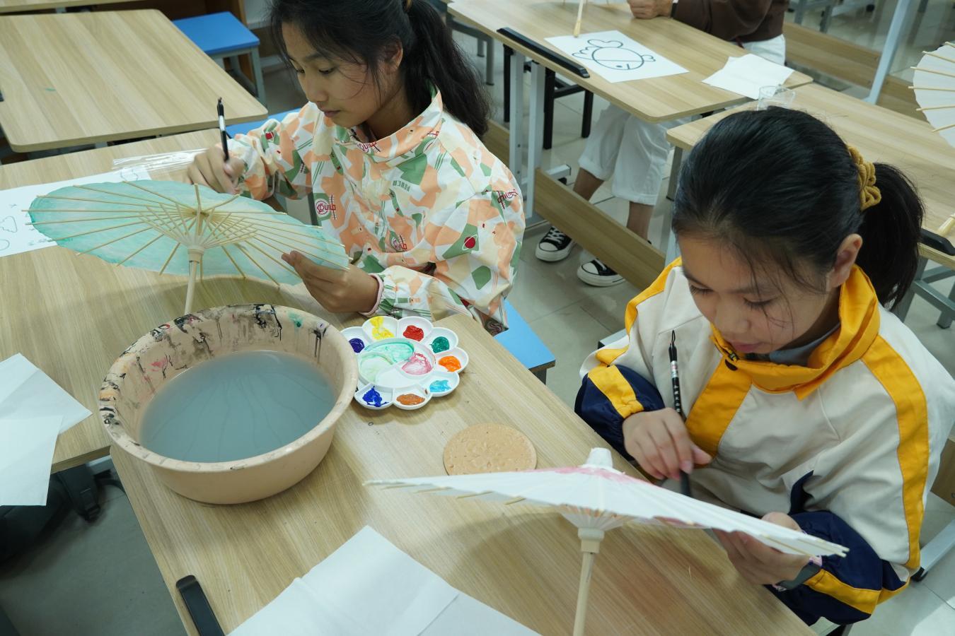 随后,由特邀嘉宾张丽娜老师讲解非遗皮雕工艺的起源与工艺流程,让小学生体验皮雕的工艺流程并制作皮雕钥匙扣。活动最后由现代流通学院的罗羿寒老师讲解壮族油纸伞工艺的起源与工艺流程,让学生亲自在空白伞面绘上图案,晒干等方式体验壮族油纸伞的伞绘工艺,感受贵港壮族油纸伞文化,以帮助学生了解广西丰富的非物质文化遗产,感受地方特色文化的魅力。