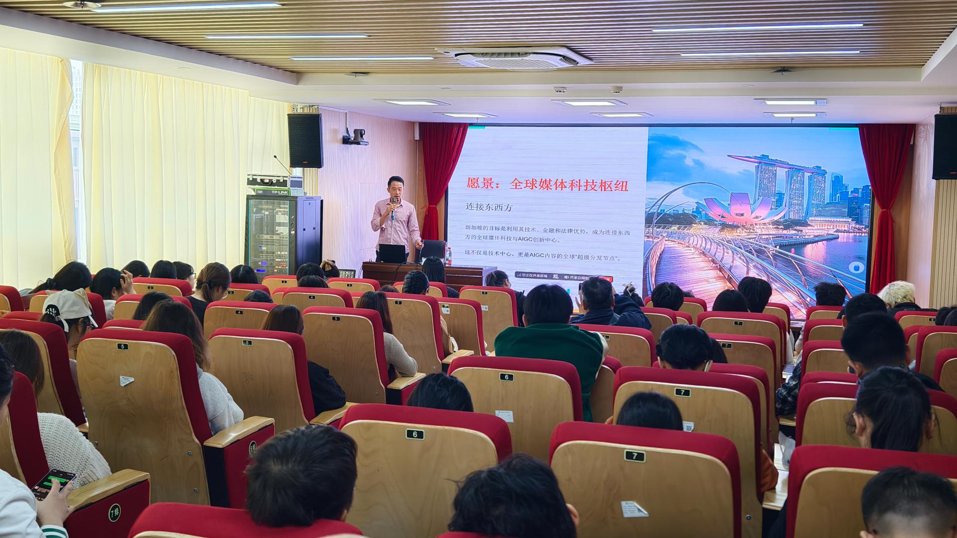 为紧跟全球AIGC技术发展浪潮及国际前沿趋势,深入解读AIGC在职业教育领域的创新应用,助力师生把握行业前沿动态、拓展跨境合作视野,2025年11月17日上午,在大学路校区图书馆8楼学术报告厅举办“金鳞计划”AIGC赋能职业教育专题讲座,邀请新加坡特拉诺瓦科技有限公司CEO许杰莅临我校开展题为“AIGC影视市场洞察:从新加坡到东盟”的专题讲座。参加此次讲座的师生代表约100人,讲座由数字艺术学院院长叶军主持。