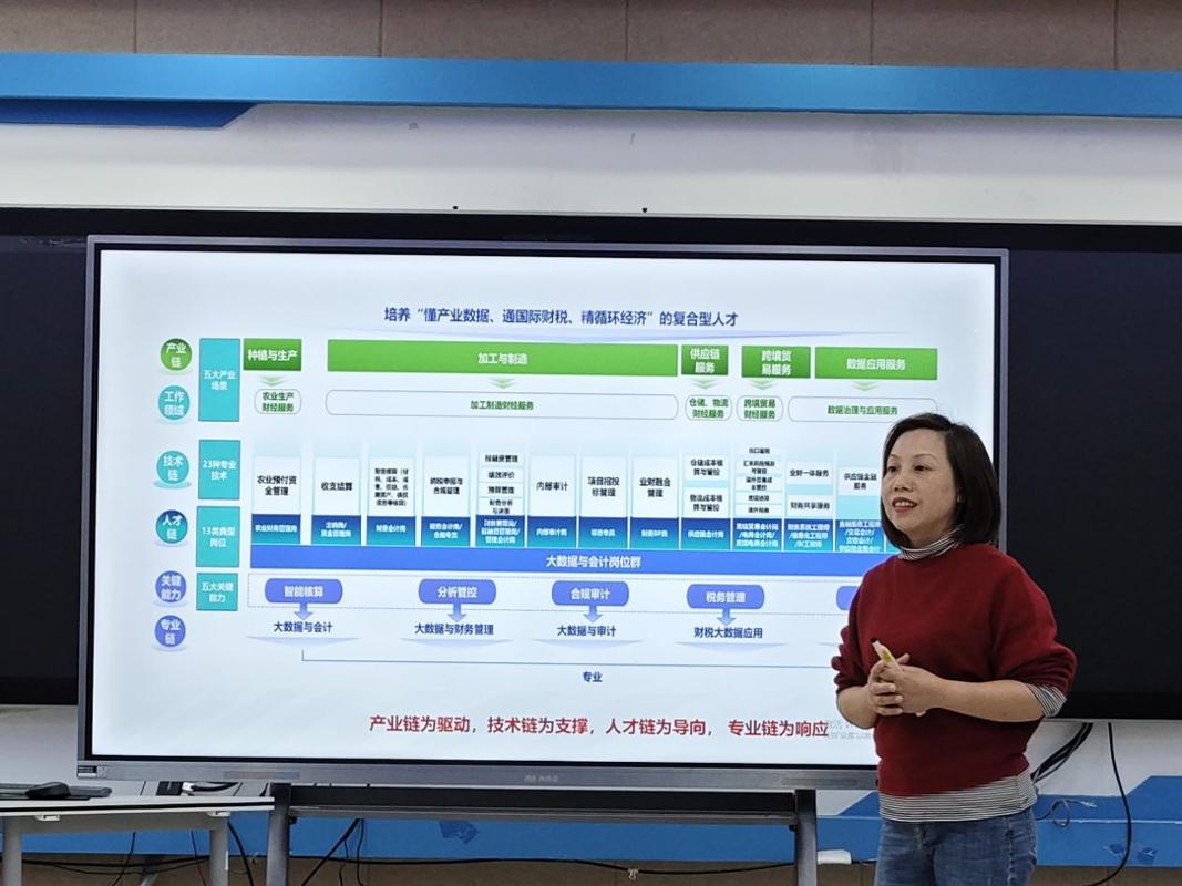 会计学院院长徐爱菲首先介绍了学院发展概况、专业调整规划与专业群组群逻辑,重点阐述了专业群与广西糖蔗产业链的对接情况。她强调,学院坚持以服务区域经济为导向,愿与企业共同探索产教融合新路径。