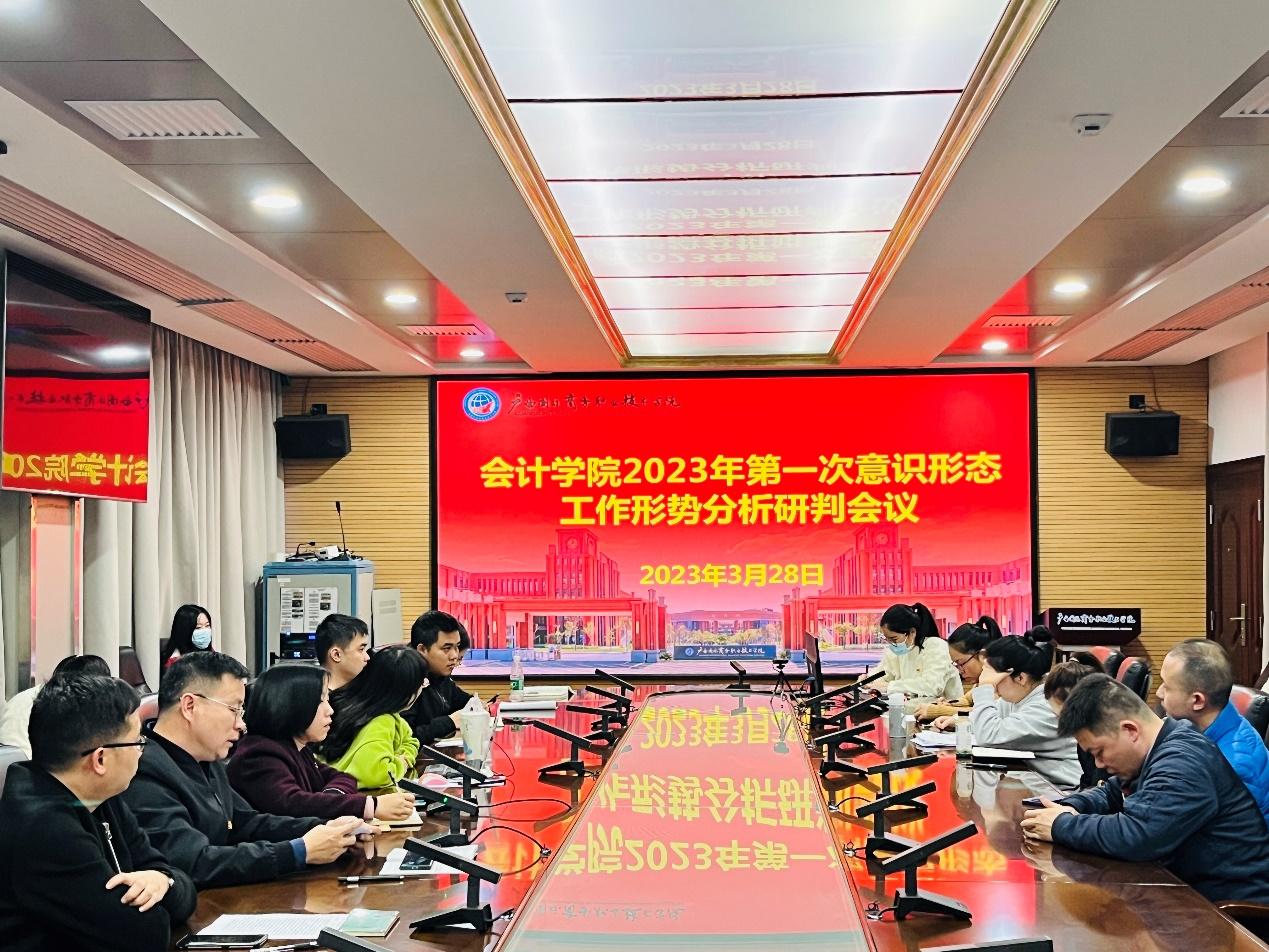 3月28日下午,会计学院在大学路校区2栋1楼会议室召开了2023年第一次意识形态工作会议,学院全体教职工参加了此次会议,会议由学院党总支书记袁维新主持。