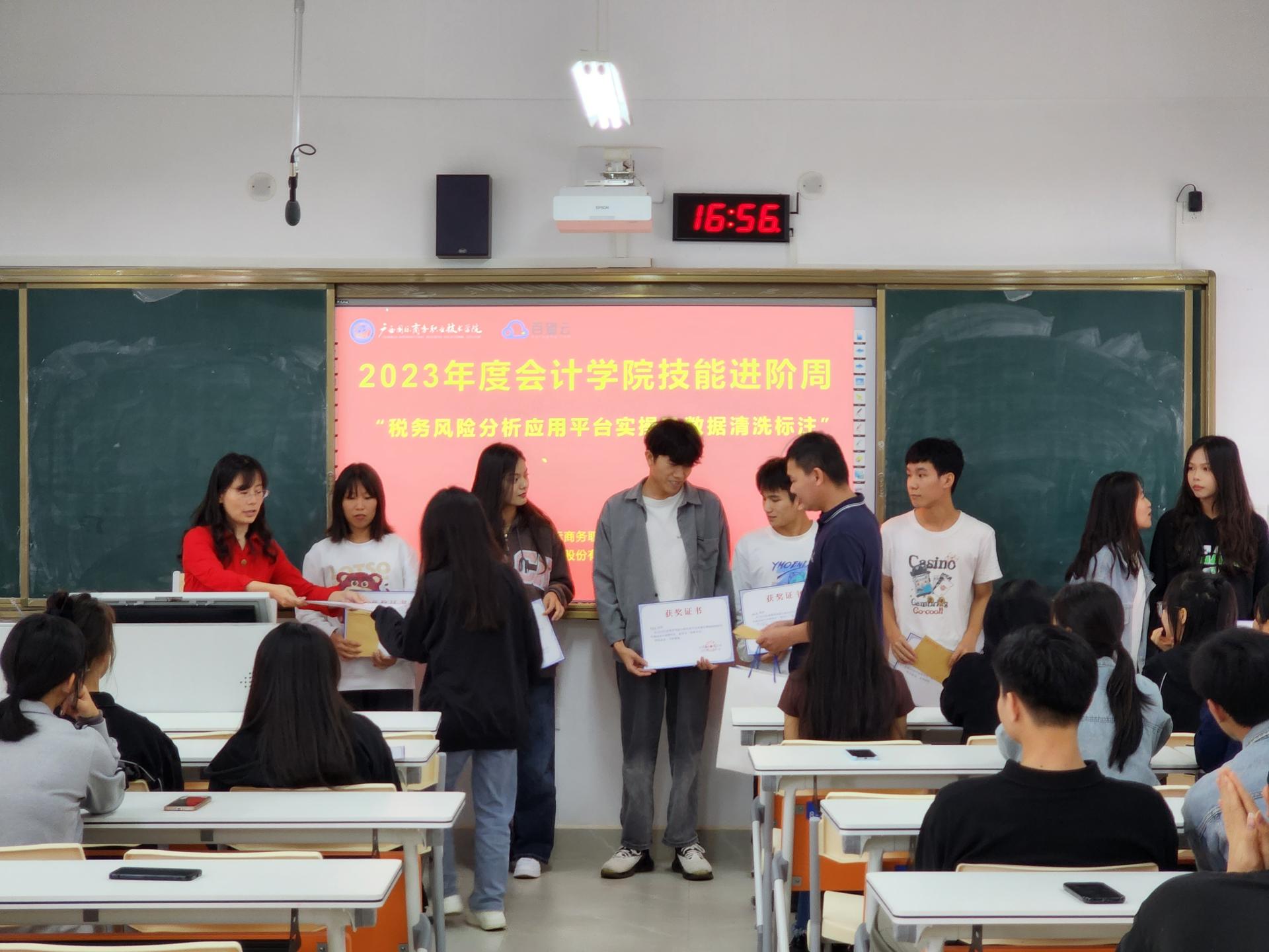 会计学院副院长李凌为取得优异成绩的学生颁发奖状,百望股份有限公司的技术老师为学生发放奖金。希望通过这种方式达到以赛促学,以学促用的目的。