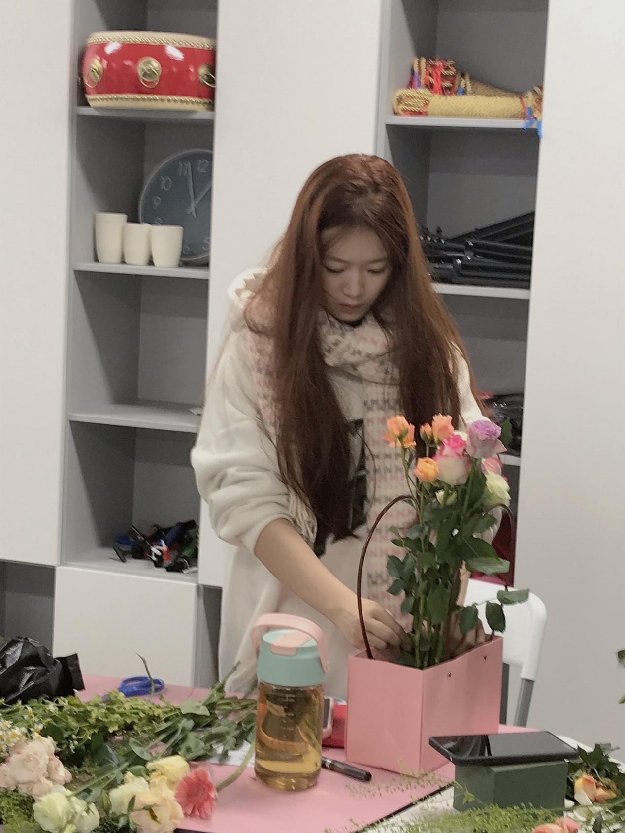 活动开始,李燕老师向大家介绍了花艺活动的内容以及花艺活动对于我们心理和生活带来的治愈作用。活动包括“选出自己最爱的花——制作自己的花艺作品——分享作品表达内涵”三个环节。同学们在李燕老师的指导下,将玫瑰、向日葵、满天星等多种花材修剪、整枝,再根据不同的色彩、形状有层次地搭配、点缀,制作出了属于自己独一无二的作品。随后同学们积极展示自己的插花作品并分享自己的创作思路。