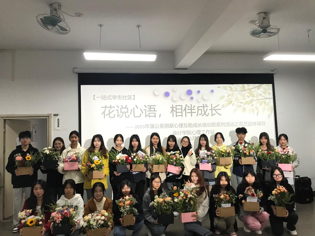 为培养学生坚强不屈、向阳而生、积极成长的学习生活态度,11月15日,会计学院蒲公英心理互助成长培训班系列活动第二期之“花说心语,相伴成长”花艺团体辅导活动在我校东盟校区心理中心三楼团体活动室顺利举行。本次花艺团体辅导活动由会计学院李燕老师带指导同学们开展。