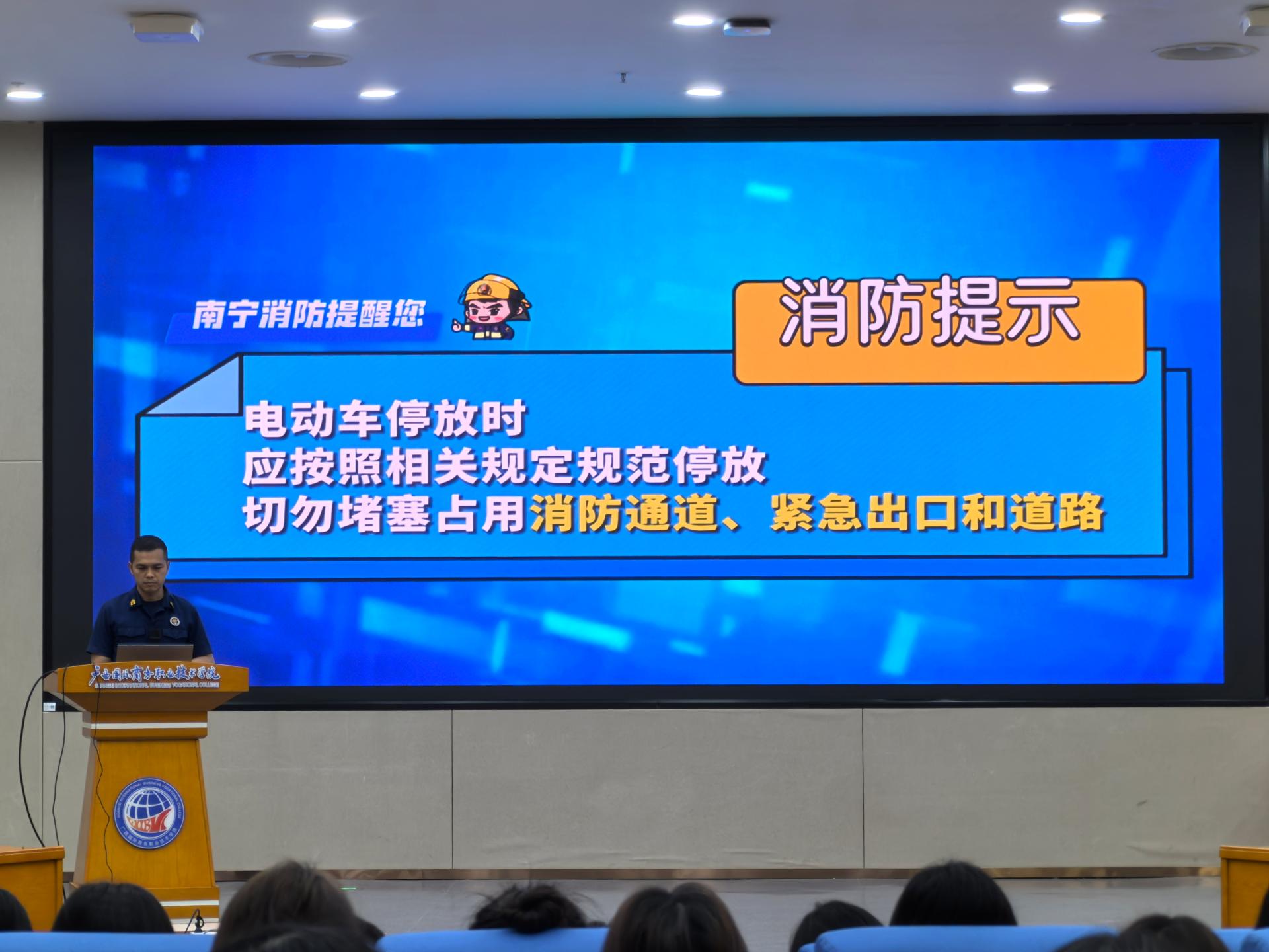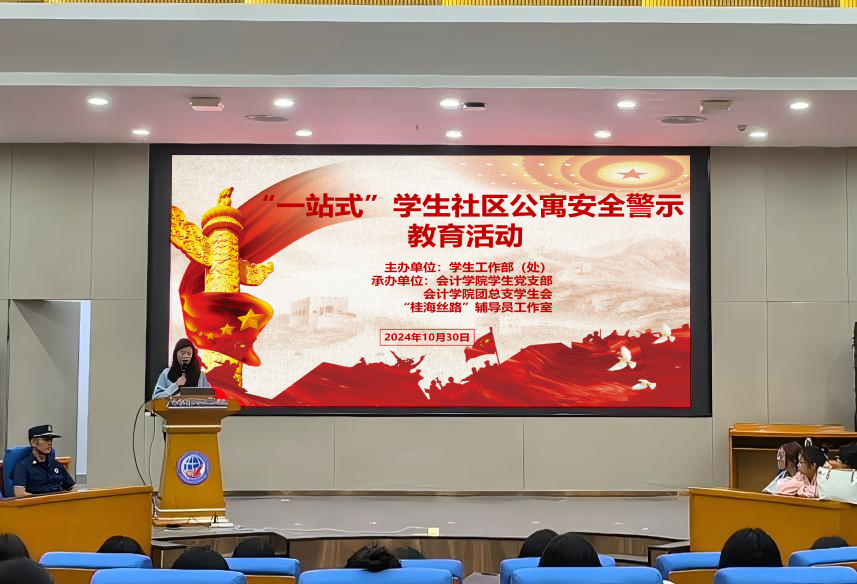 为了深化消防安全意识,提高火灾预防与应急响应能力,会计学院于2024年10月30日在图书馆学术报告厅承办了以“‘守护青春,蓝焰同行’公寓消防实践培训”为主题的活动。本次活动由学生工作部(处)主办,会计学院携会计学院学生党支部、会计学院团总支学生会、“桂海丝路”辅导员工作室及会计学院学生公寓管理小组共同承办。活动荣幸邀请到武华消防救援站站长助理韦建民出席,会计学院辅导员代表及学生代表共240人参与了此次活动。