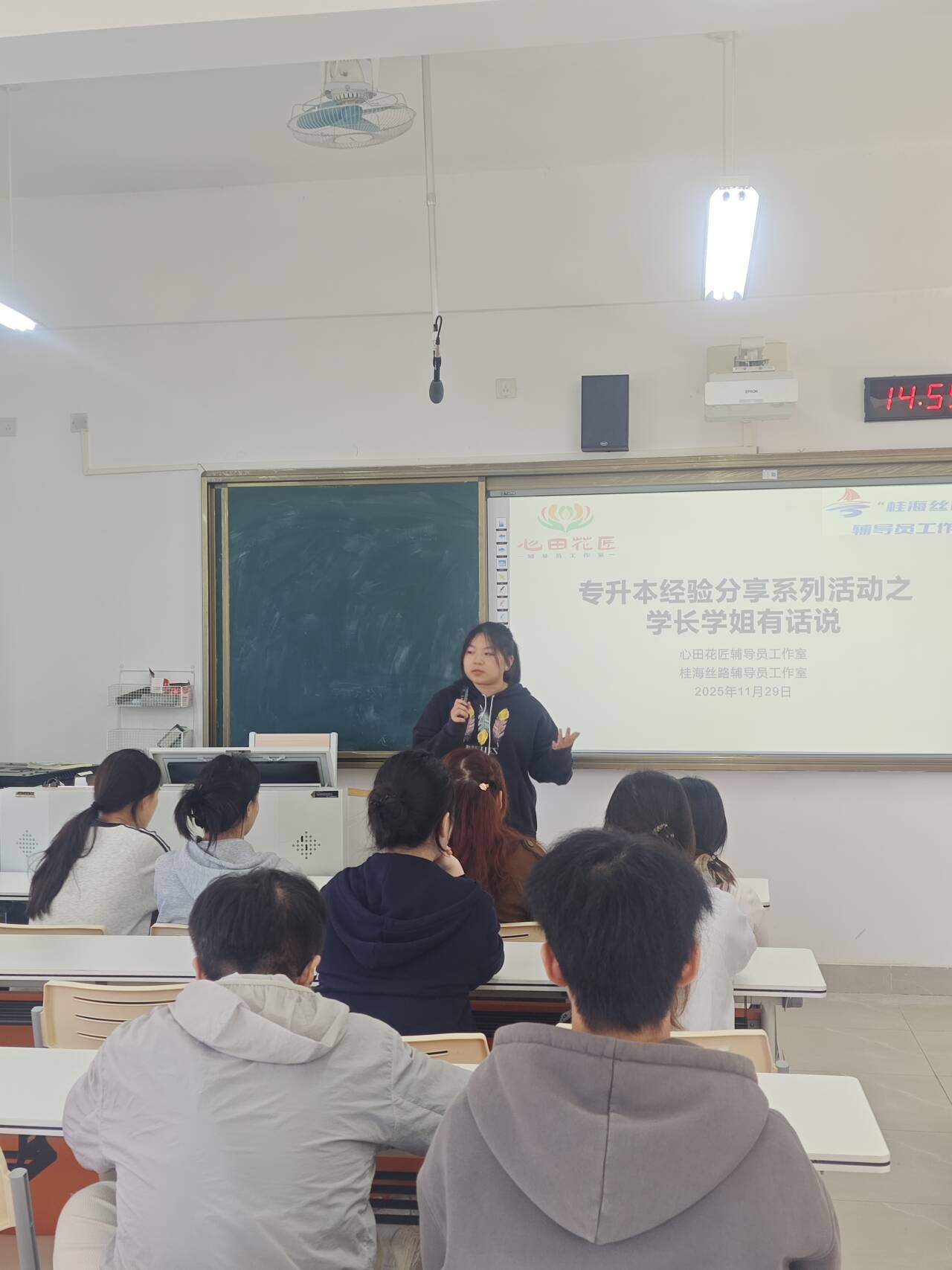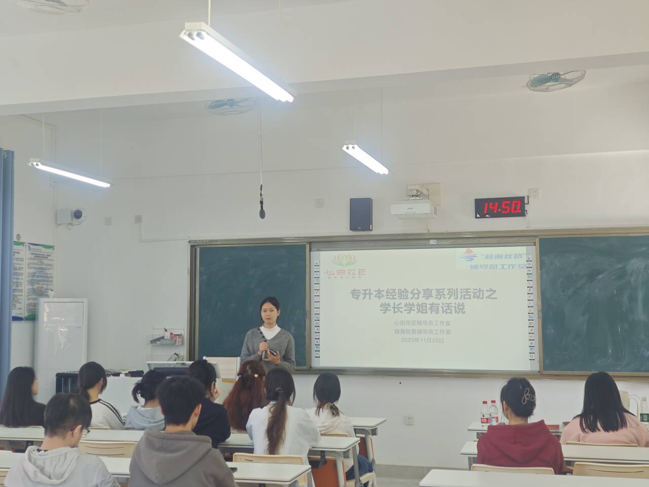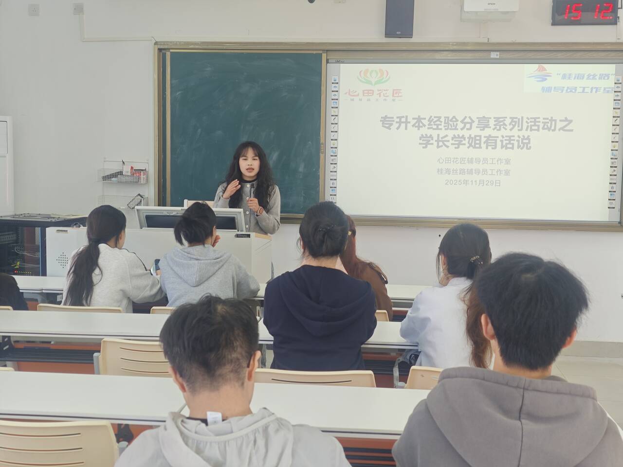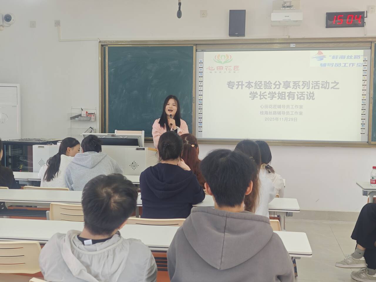 为持续深化党建引领育人实效,搭建朋辈互助的成长平台,精准服务学生学历提升需求,近日,心田花匠辅导员工作室成功在东盟校区8-1-302举办了“专升本赋能计划:学长学姐有话说”专题经验分享会。本次活动由李燕主持,特邀我校2025年成功专升本至广西民族大学、广西财经学院等高校的六位优秀学长学姐担任主讲,为备考学子传经送宝,现场互动热烈,气氛温馨。