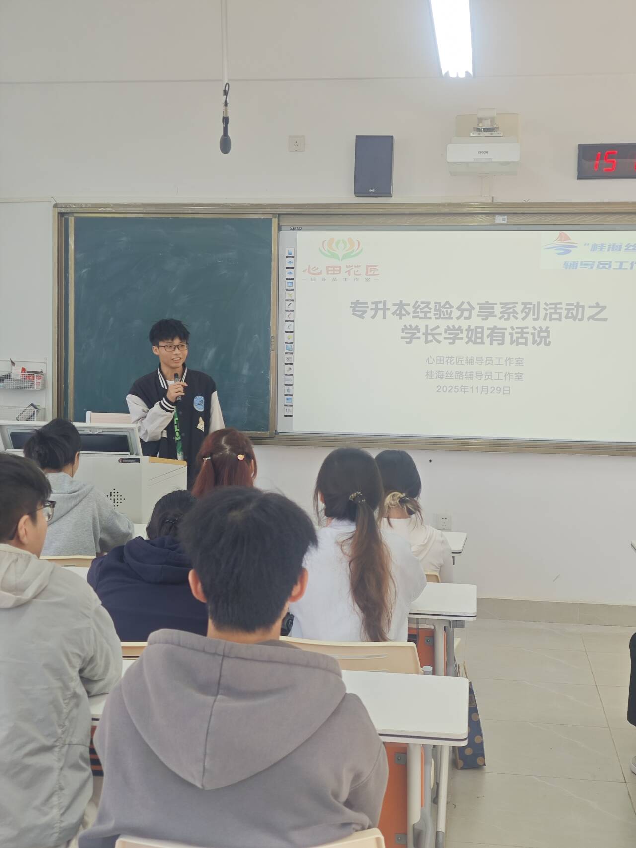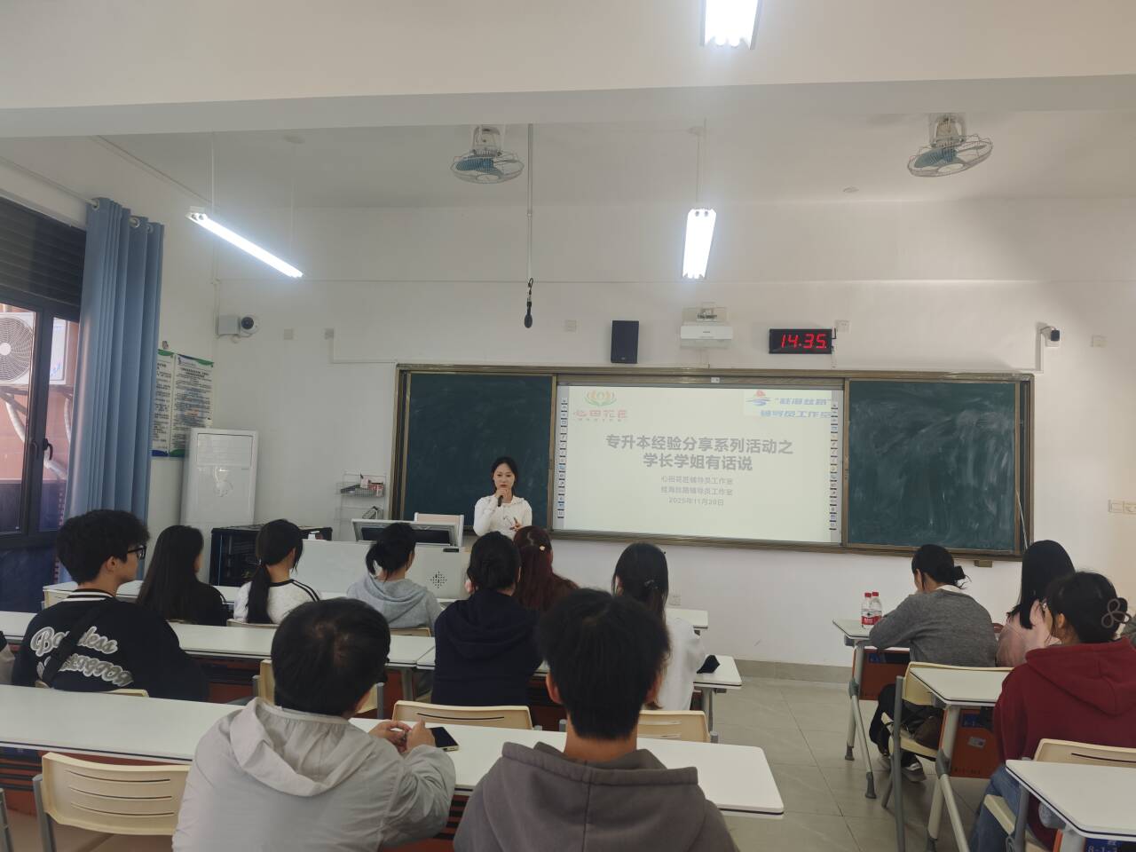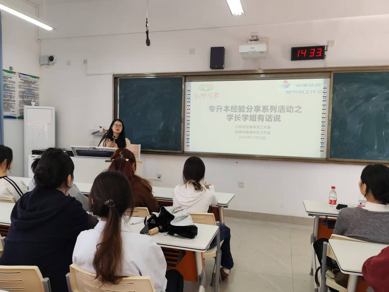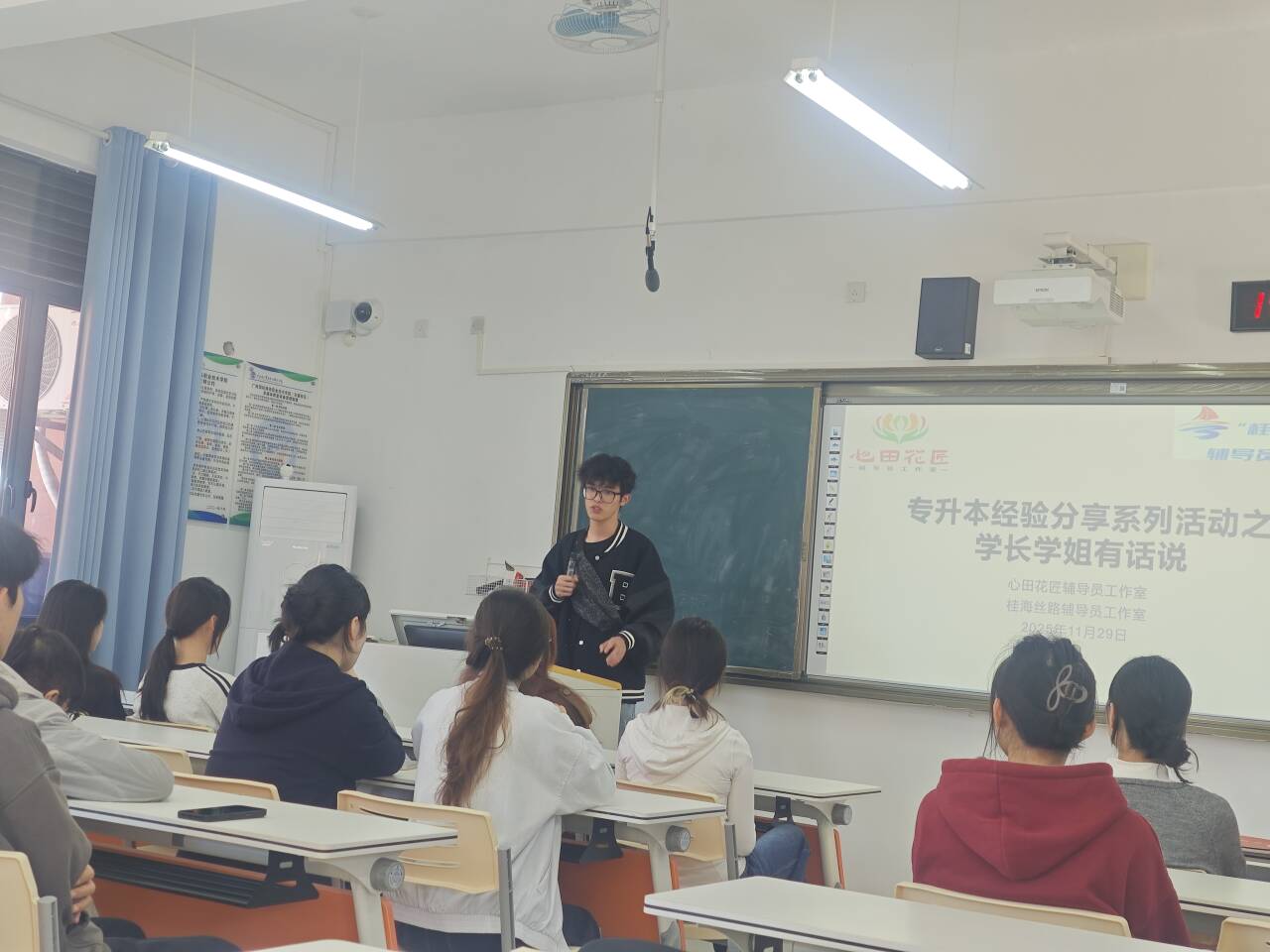 为持续深化党建引领育人实效,搭建朋辈互助的成长平台,精准服务学生学历提升需求,近日,心田花匠辅导员工作室成功在东盟校区8-1-302举办了“专升本赋能计划:学长学姐有话说”专题经验分享会。本次活动由李燕主持,特邀我校2025年成功专升本至广西民族大学、广西财经学院等高校的六位优秀学长学姐担任主讲,为备考学子传经送宝,现场互动热烈,气氛温馨。