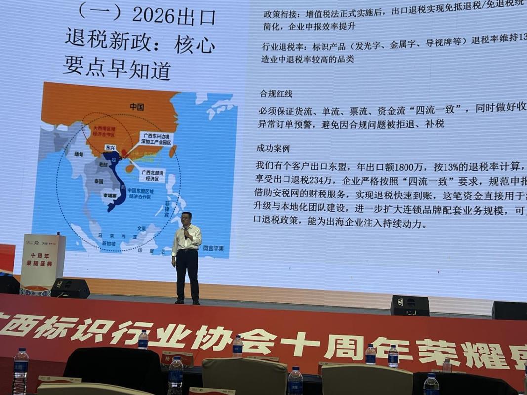 本次盛典聚焦行业发展、文化赋能、财税合规等核心议题,汇聚广西标识行业众多企业代表共商发展大计。黄健老师以《锚定东盟蓝海:广西标识行业十载磨砺,财税赋能出海新征程》为主题,结合广西标识行业十年发展历程,深度剖析企业开拓东盟市场的机遇与合规挑战。