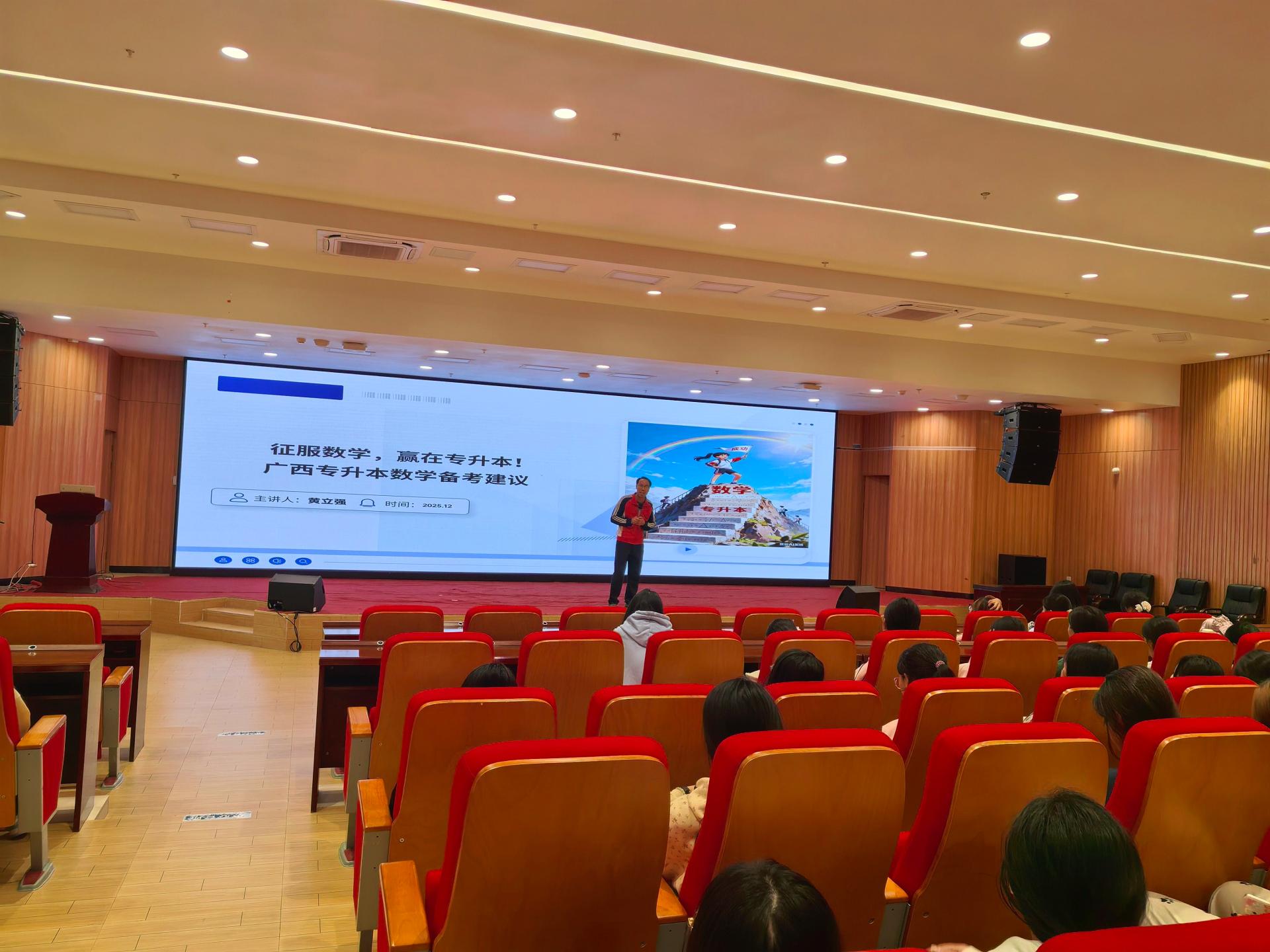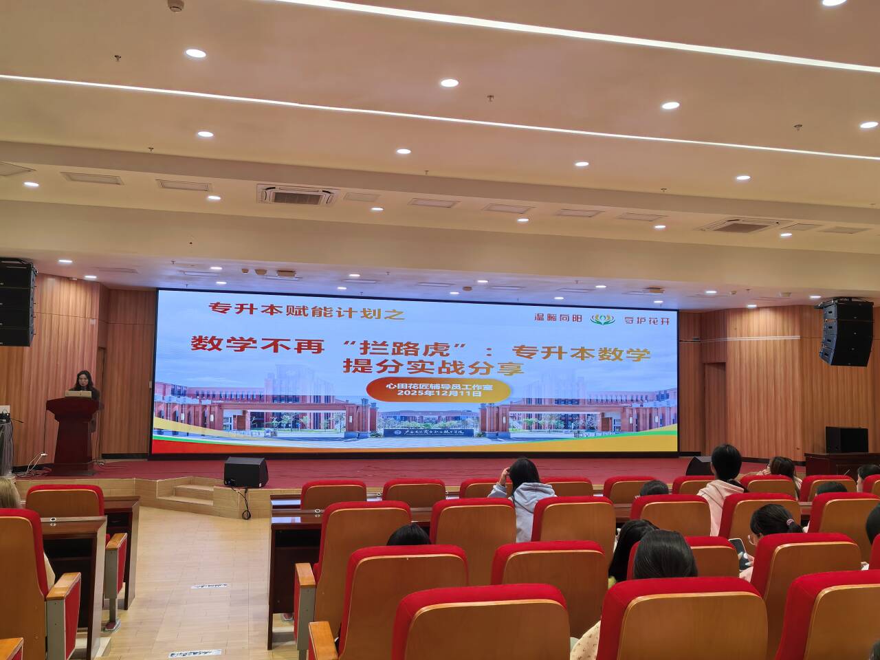 为扎实推进“我为学生办实事”实践活动,充分发挥党建引领育人作用,切实服务学生学历提升与成长需求,近日,心田花匠辅导员工作室在东盟校区师生活动中心三楼报告厅面向有志于专升本的学生,成功举办了“专升本赋能计划:数学提分实战分享”专题讲座。本次讲座由唐思琦主持,特邀我校教学经验丰富的黄立强老师担任主讲,为同学们带来了一场干货满满的数学学习指导。