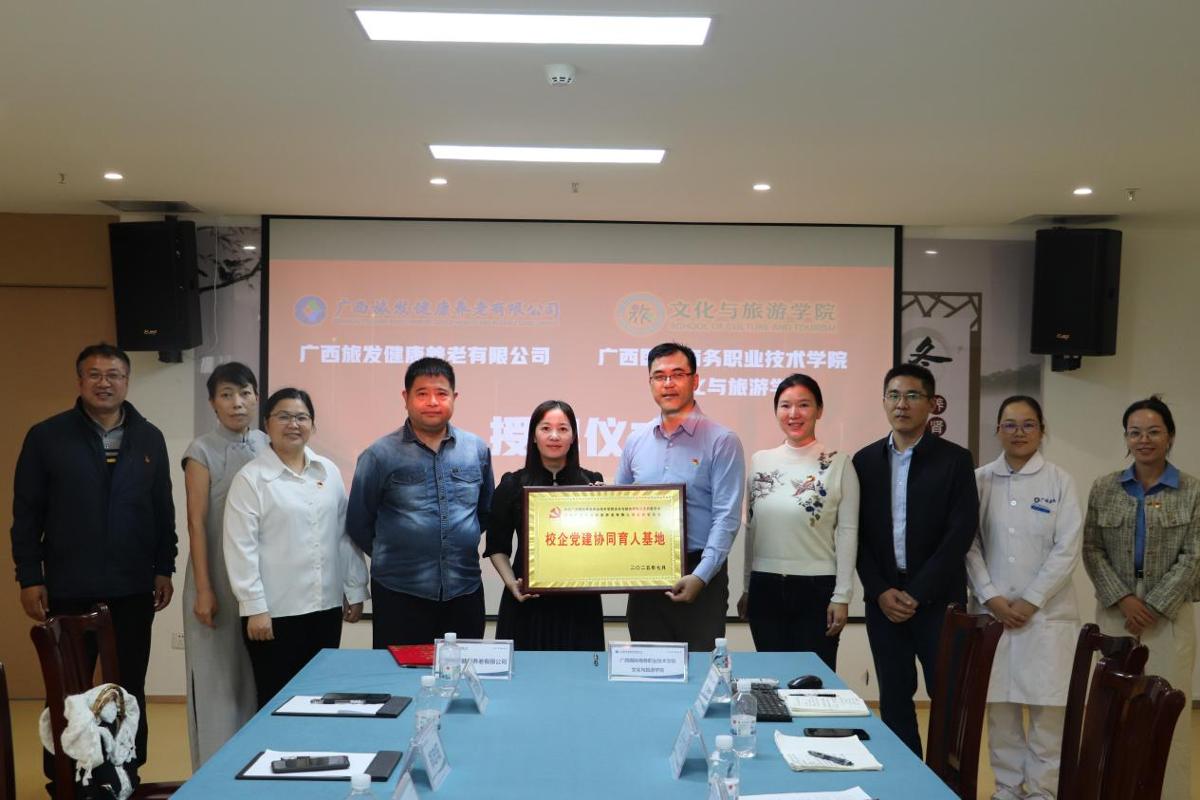 为充分发挥基层党建核心引领作用,构建“资源共享、优势互补、互相促进、共同发展”的校企党建共建格局,10月23日,文化与旅游学院(以下简称“文旅学院”)党总支书记黄恒拾、院长郑忠阳、党总支专职副书记吴柳蓉等一行6人赴广西旅发健康养老有限公司(简称“广旅养老公司”),开展以“党建引领聚合力,共建共享促发展”为主题的党建共建交流活动。活动旨在搭建校企交流合作平台,推动党建工作与业务工作深度融合,助力双方实现共同发展。