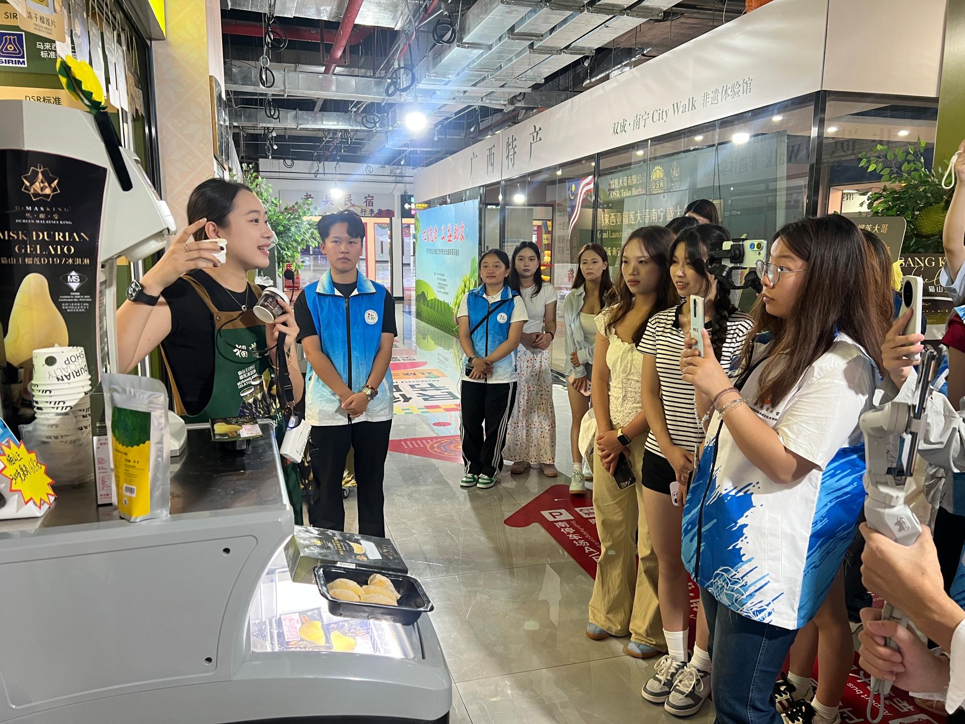 随后的“螺小丰柳州螺蛳粉”体验环节,师生在品尝地道风味的同时,聆听店铺负责人讲述螺蛳粉制作技艺的非遗传承故事。从街头小吃到年产值超百亿的产业,从手工熬制到标准化生产的创新探索,让学生直观感受非遗美食的商业转化路径。